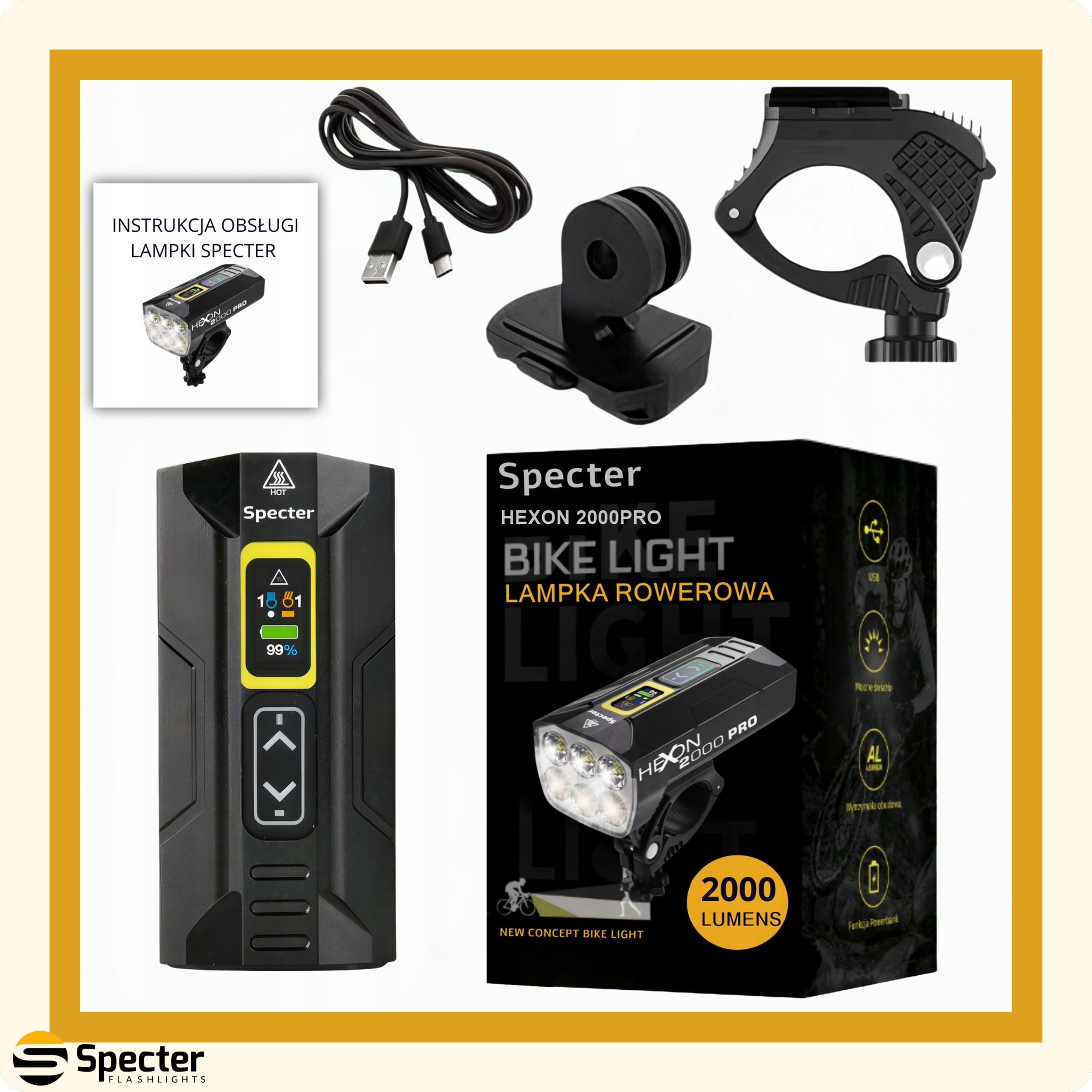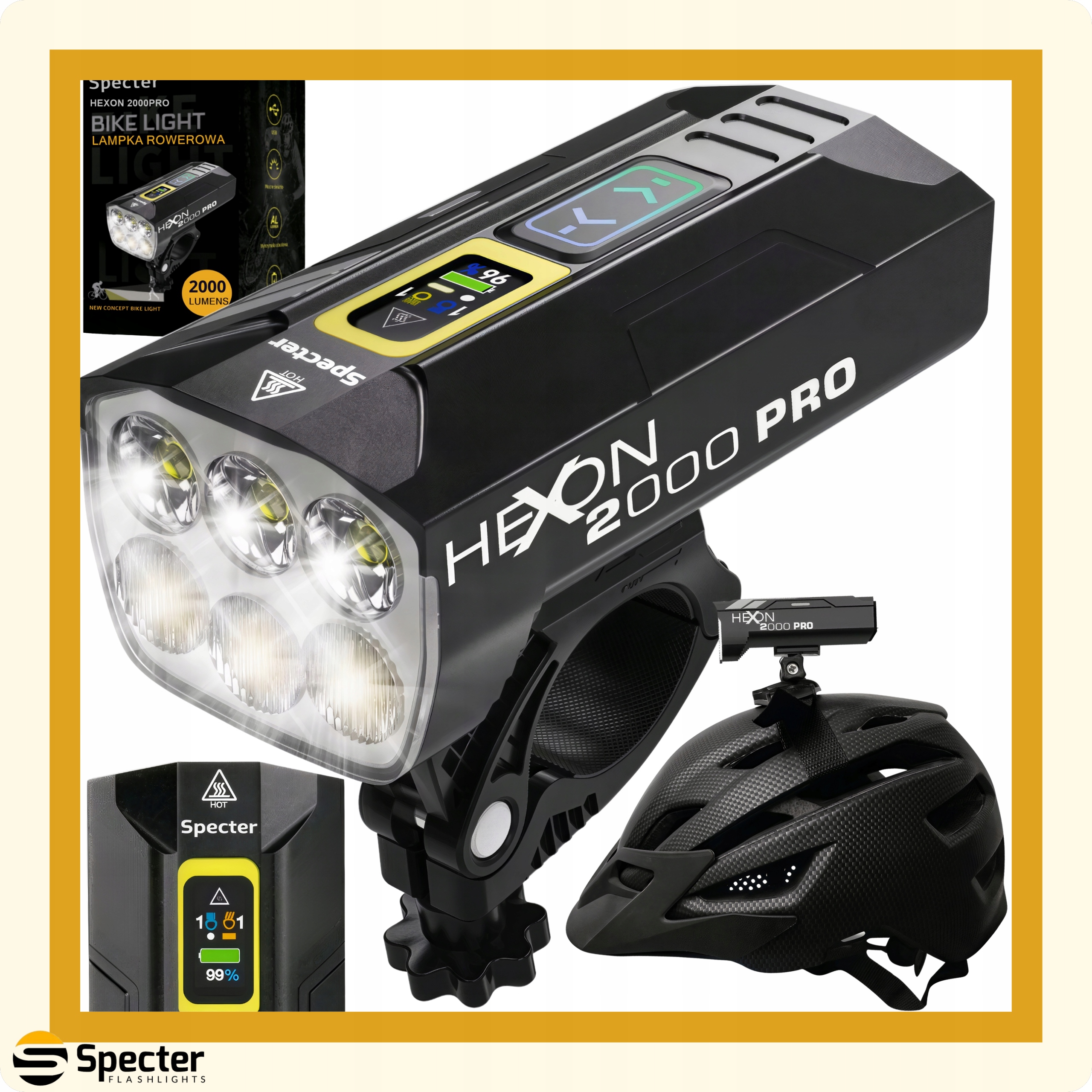 Велофара Spectre HEXON 2000PRO — профессиональный фонарь мощностью 2000 люмен со встроенным аккумулятором 10000 мАч.