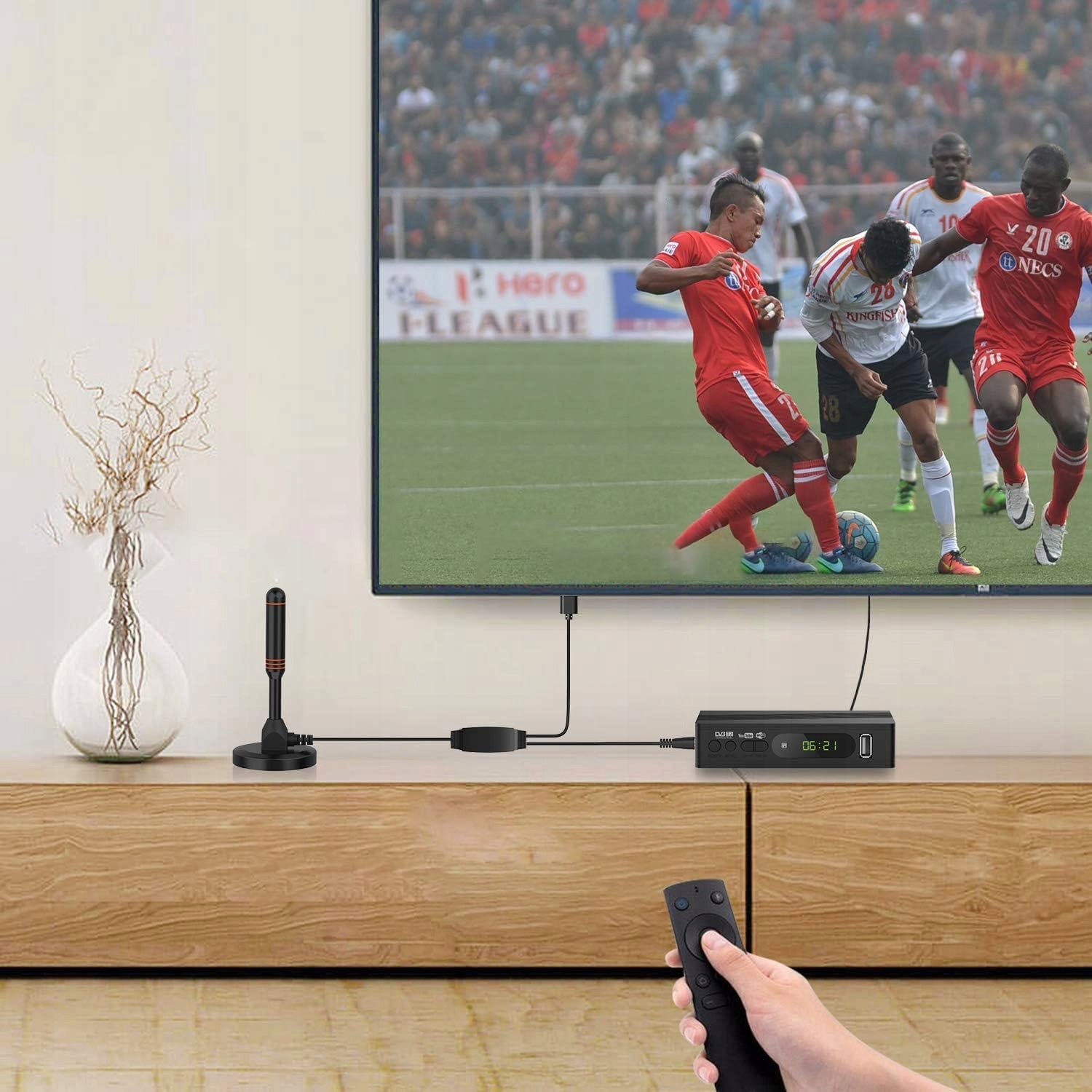 ► Очистить простую конфигурацию: просто убедитесь, что телевизор имеет подходящий разъем, подключите его к розетку TV/HDMI и расположите где -нибудь. Используя стандартный концентрический разъем, устройство может легко работать практически с любым портативным телевизором или телевизором в гостиной. Примечание. Во время сборки рекомендуется поместить его на столу или стену, предпочтительно рядом с окном, чтобы обеспечить оптимальный прием сигнала.