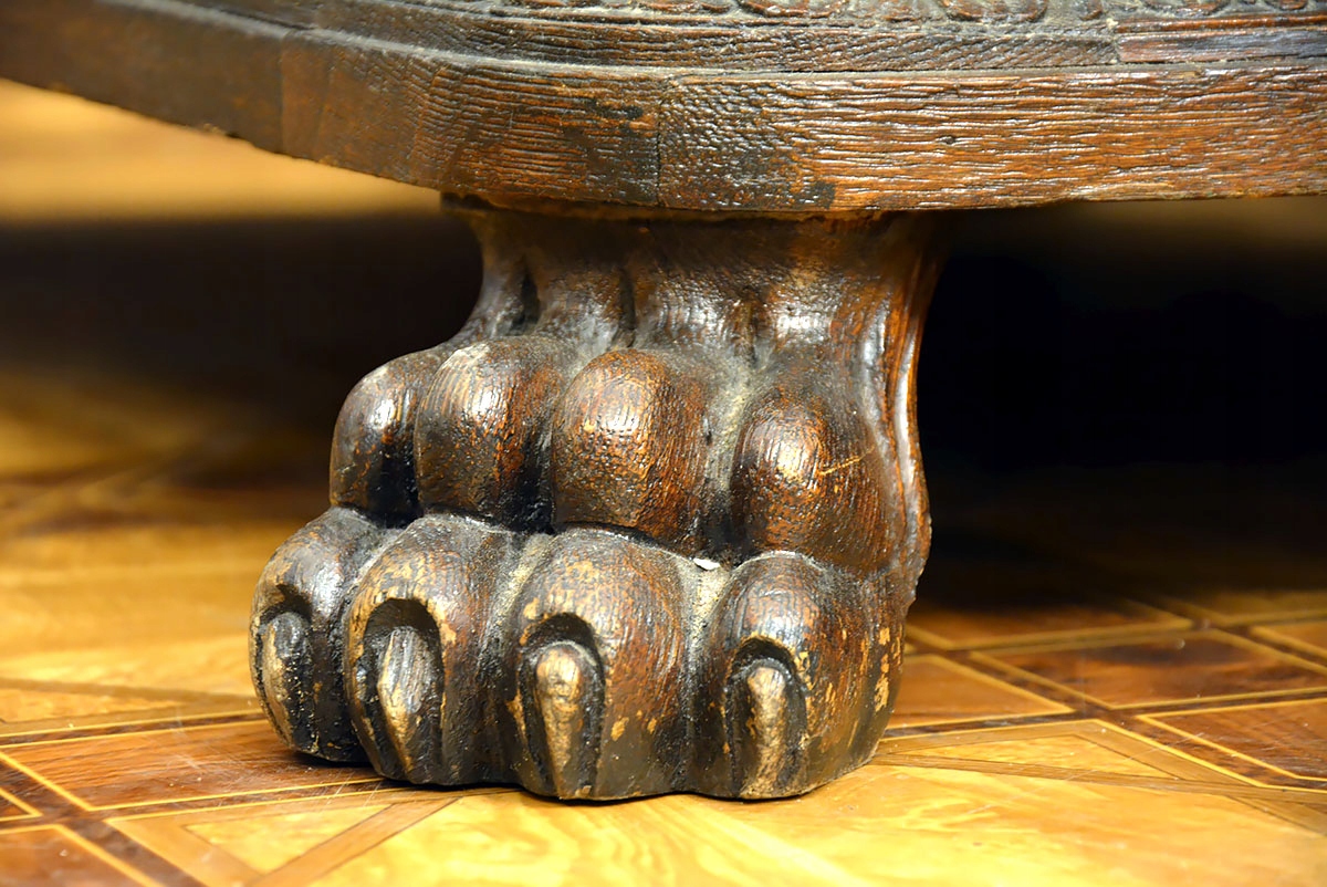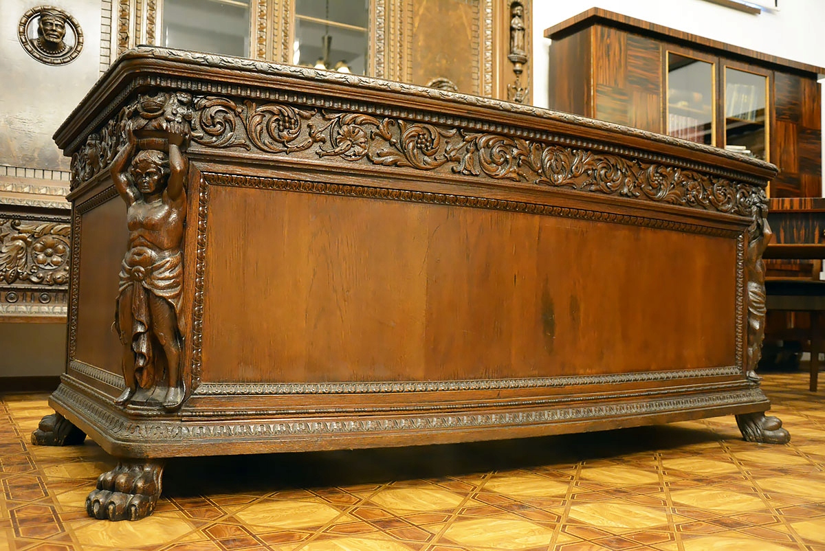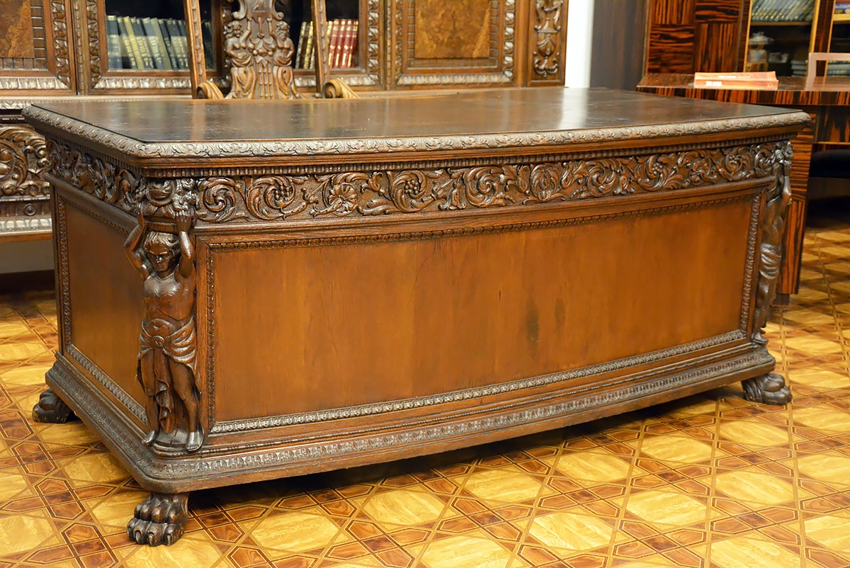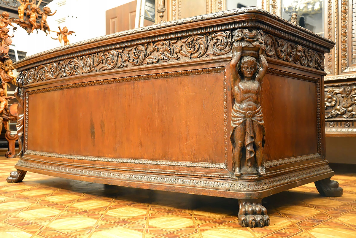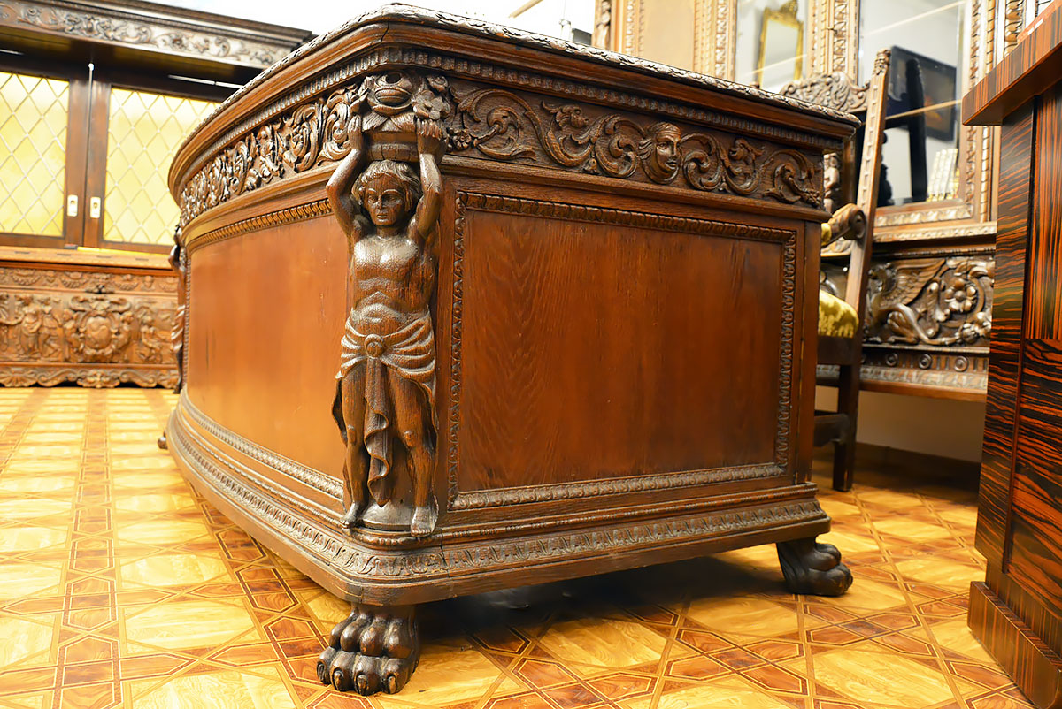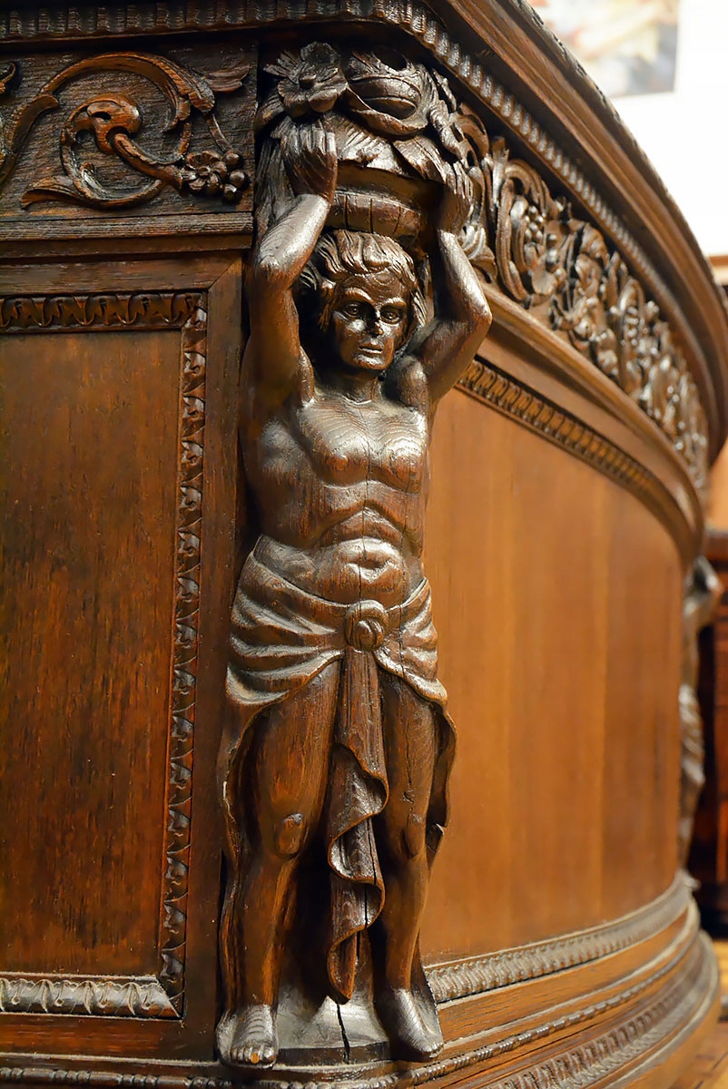 Мощный и репрезентативный стол, богато украшенный полными пластическими скульптурами, многочисленными украшениями растений.