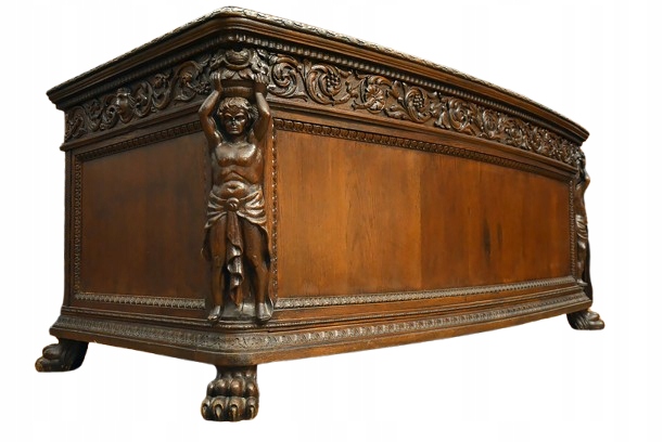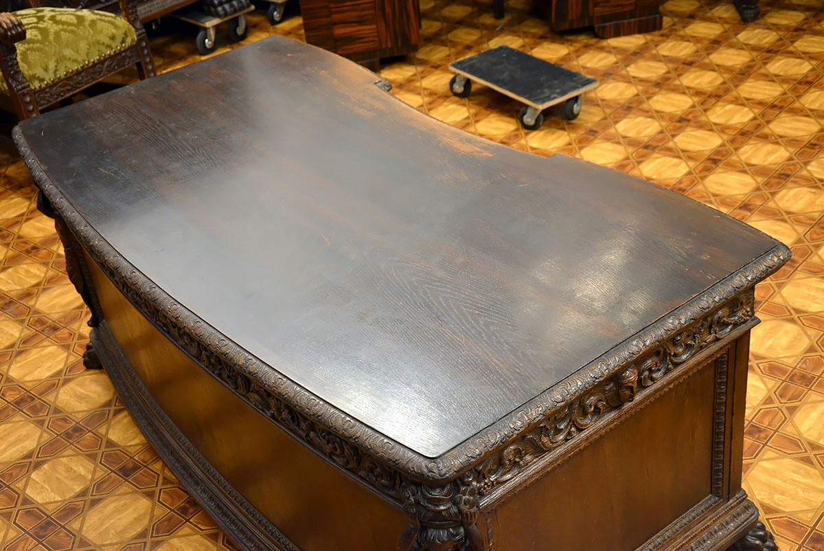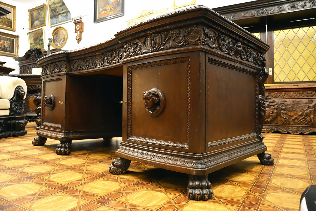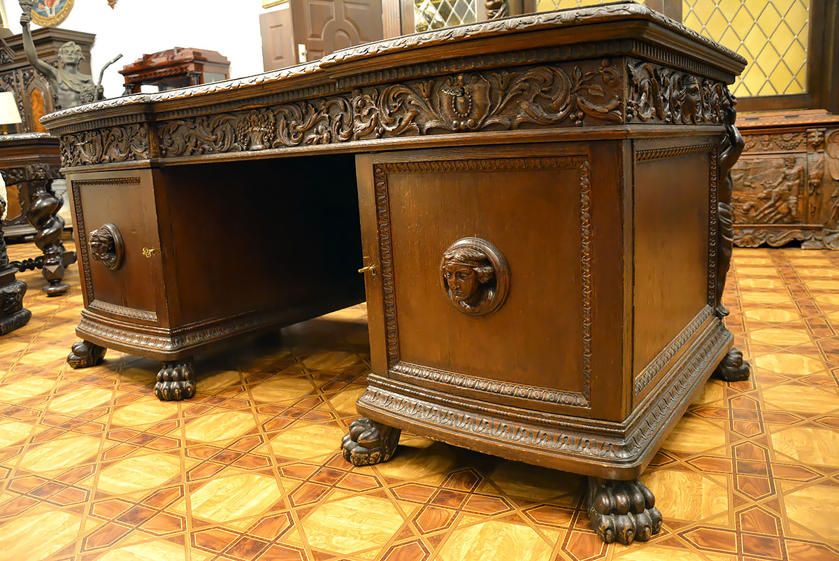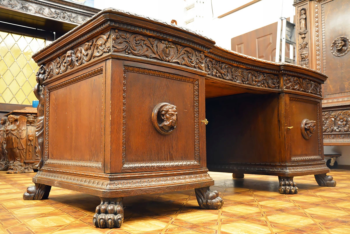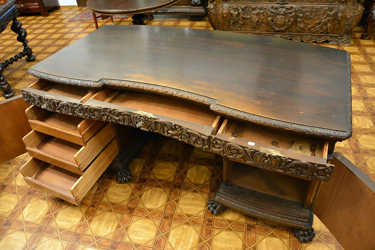 Мощный и репрезентативный стол, богато украшенный полными пластическими скульптурами, многочисленными украшениями растений.