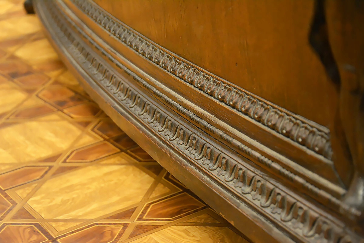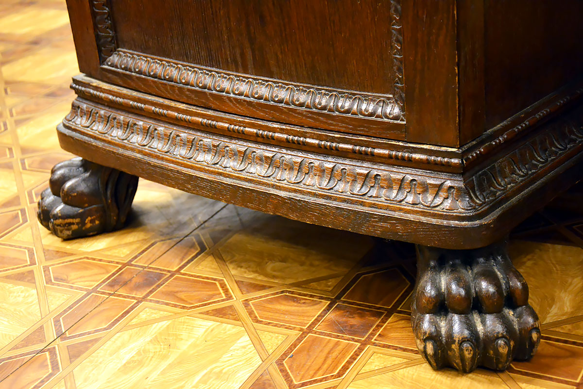 столовые ножки (до 6) в виде лап львов. Профилированная дверь - округлена. В центральной части двери резные головы мужчины и женщины. Под столешницы три глубоких ящика с бассейном. Пространство ног посередине.