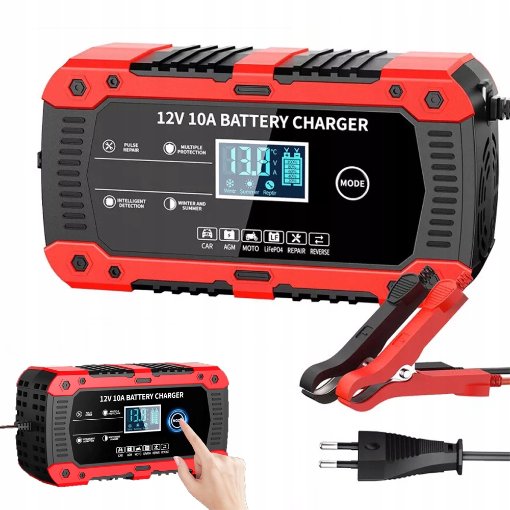 Автомобильное зарядное устройство 10 А, интеллектуальное полностью автоматическое автомобильное зарядное устройство 12 В, зарядное устройство с температурной компенсацией и ЖК-дисплеем для автомобилей, мотоциклов и грузовиков (красный и черный)