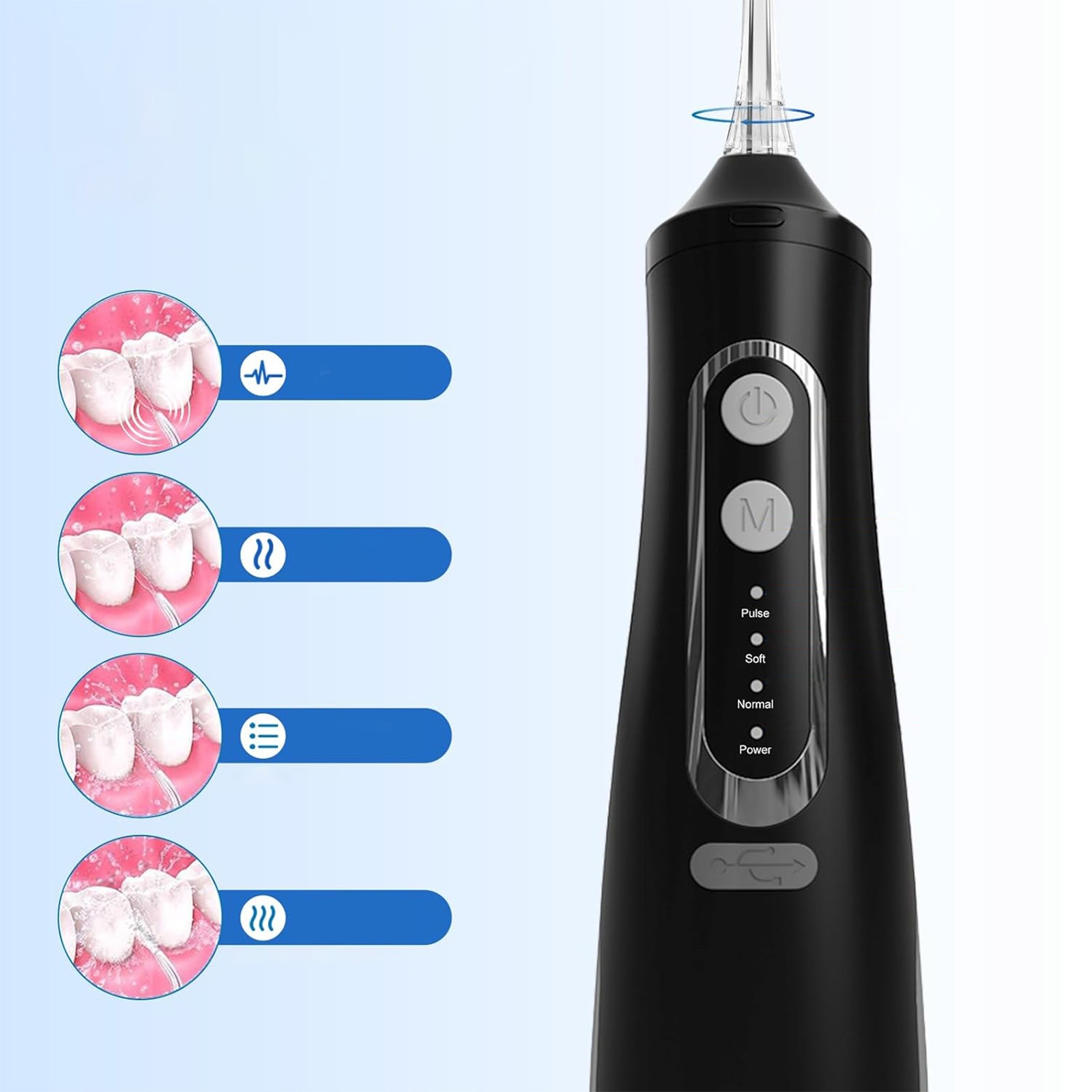 Беспроводной ирригатор полости рта имеет 4 режима (сильный, нормальный, мягкий, импульсный) и 4 различных насадки для удовлетворения различных потребностей в чистке. 🗜 🪥