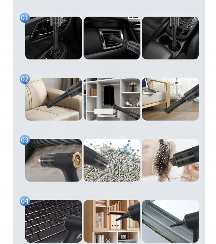 - Чистка автомобиля: Воздуходувка полезна при чистке салона автомобилей, удалении пыли из кондиционеров, вентиляции и другие труднодоступные места.