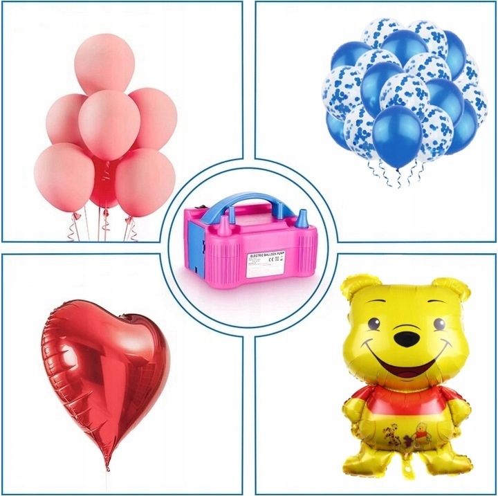 Устройство прост в использовании. Для использования достаточно подключить его к источнику питания, включить кнопку и начать надувать воздушные шары.