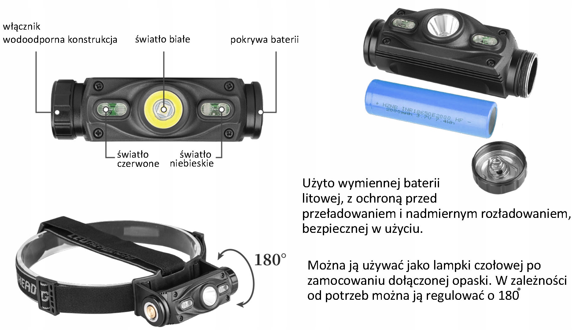 Фонарь оснащен красными и синими предупредительными диодами, которые повышают безопасность велосипедистов и пешеходов. Угол освещения вниз 180° и удобный мягкий регулируемый ремень обеспечивают полный комфорт использования независимо от размера головы и рабочего места.