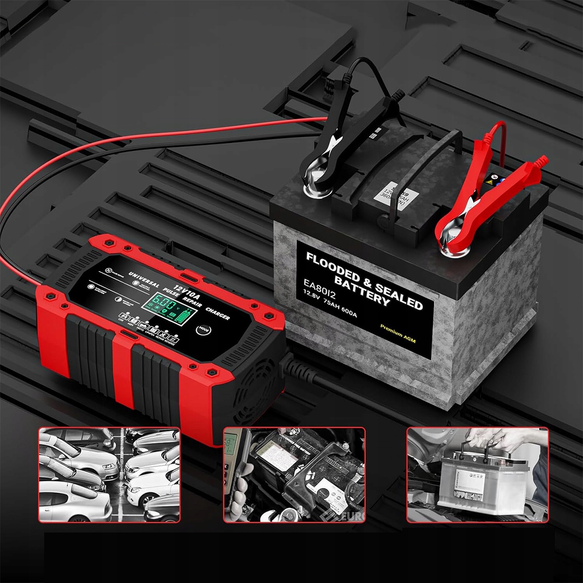 Car Charger 10a, интеллектуальное, полностью автоматическое автомобильное зарядное устройство 12 В, зарядное устройство с температурной компенсацией и ЖК -дисплей для автомобилей, мотоциклов, грузовиков (красный и черный)