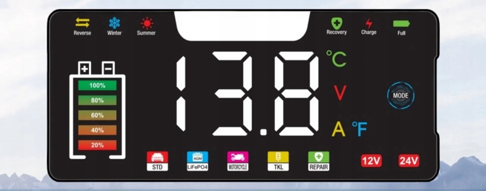 📲⚡Интуитивное сенсорное управление с четырьмя режимами зарядки(Авто/Старт-Стоп/Мотоцикл/Техническое обслуживание).