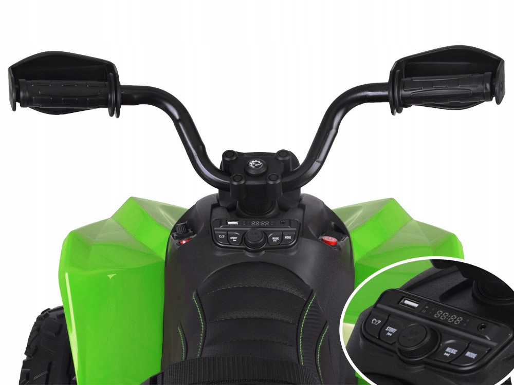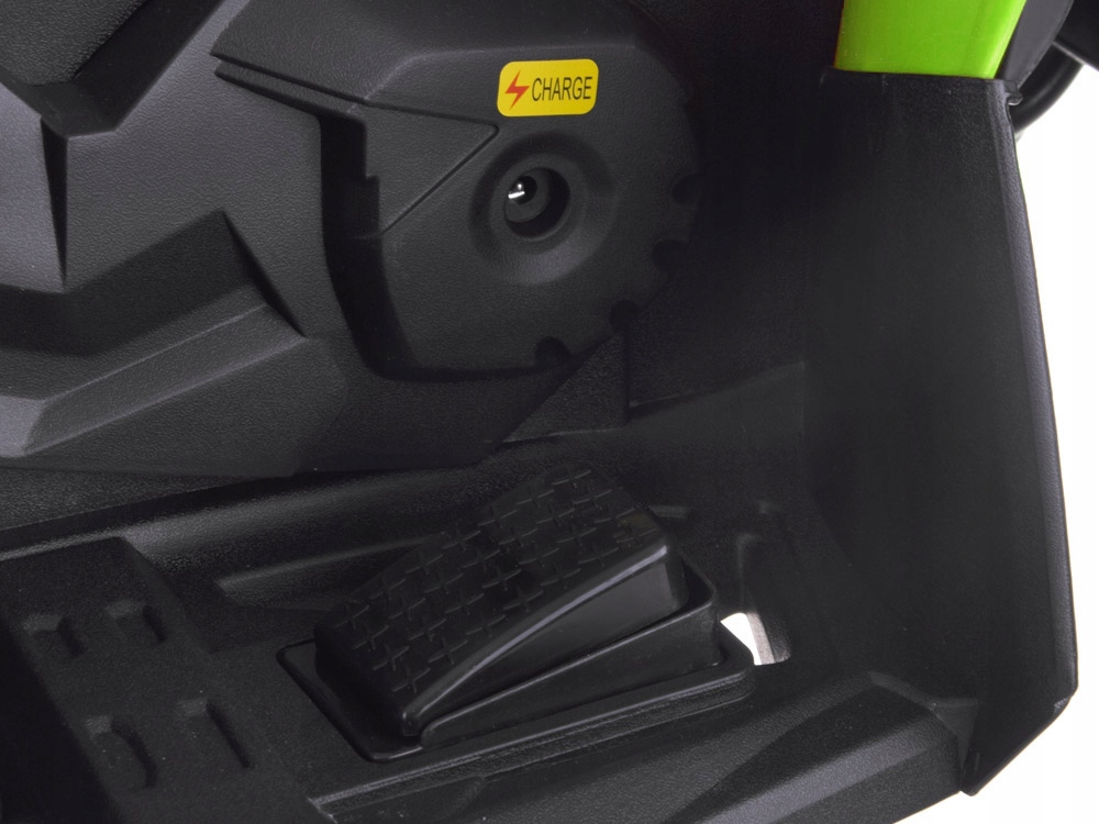 Благодаря двум мощным двигателям квадроцикл легко справляется с холмами, неровностями и травой. Транспортное средство заводится с помощью красной кнопки, и после запуска ребенок слышит звук запуска двигателя.