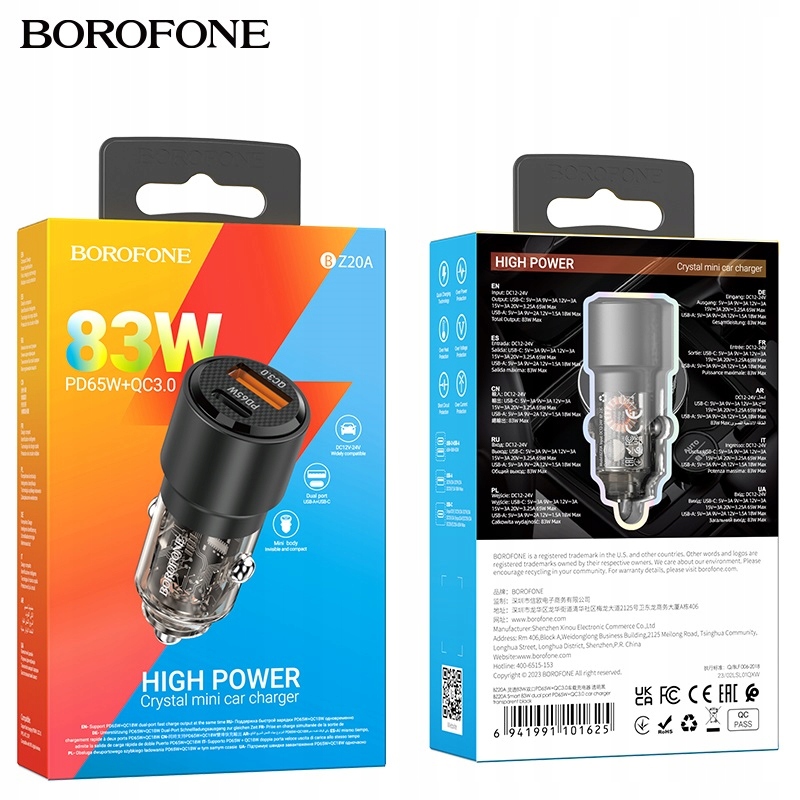 BOROFONE BZ20A Smart — очень быстрое и мощное автомобильное зарядное устройство с одним портом USB Type-C/Type C/Type C/USB-C, с выходной мощностью 65 Вт, стандартом Power Delivery/PD и вторым портом стандартного USB-A с выходной мощностью 65 Вт. 18 Вт в стандарте Quick Charge 3.0/QC3.0. Суммарная мощность зарядного устройства при одновременной зарядке двух устройств составляет 83 Вт. Зарядное устройство обеспечивает сверхбыструю зарядку для 99 % мобильных устройств, доступных на нашем рынке.