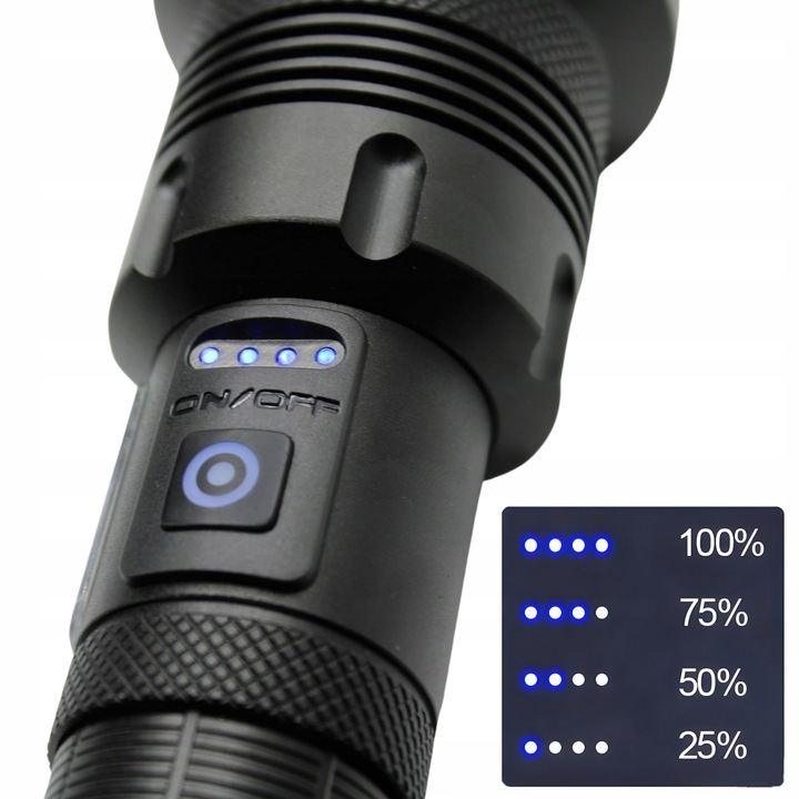 Четыре светодиода показывают, насколько заряжен фонарик, благодаря чему вы сможете предотвратить неожиданный разряд и будете знать, когда аккумуляторы заряжены.
