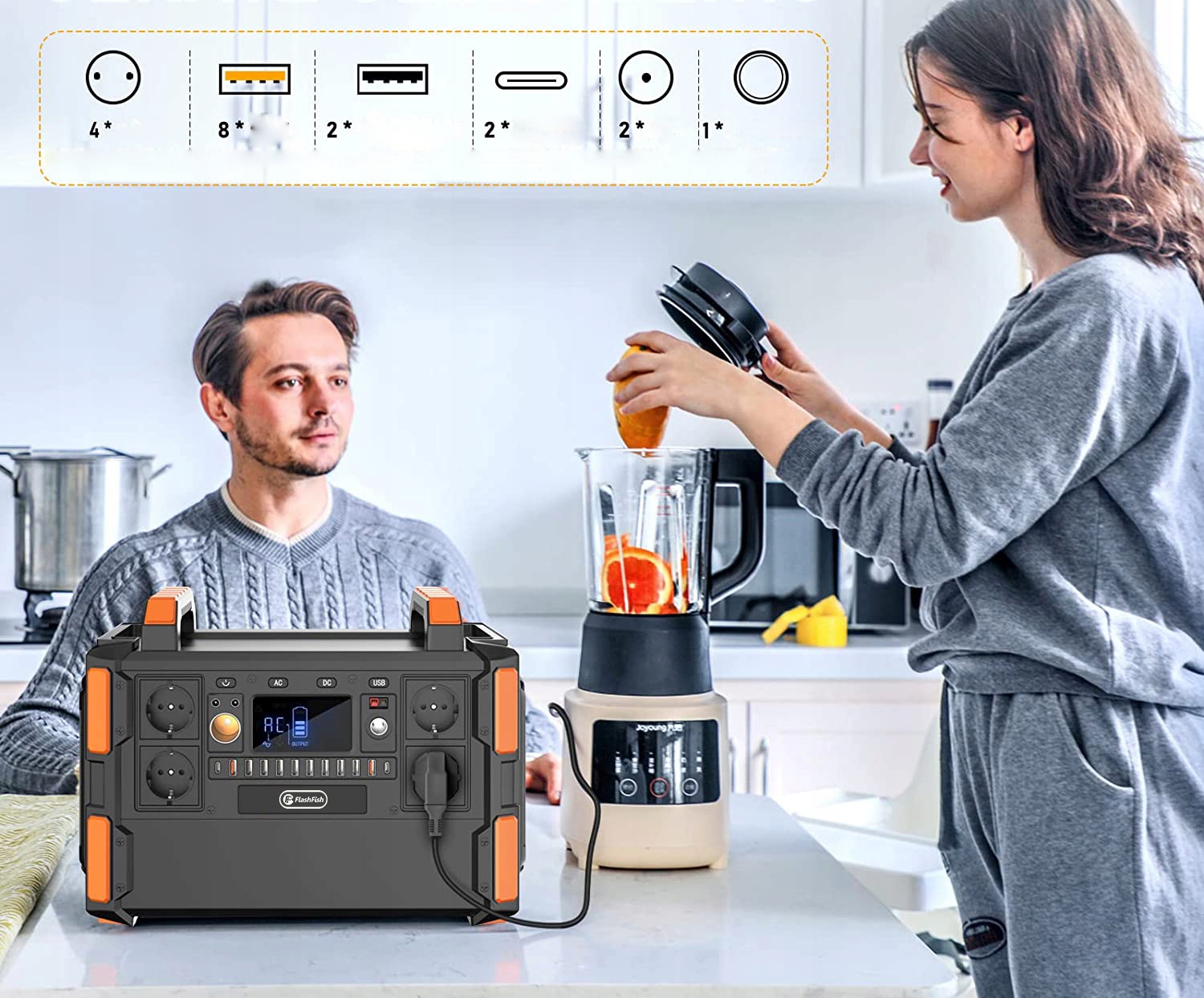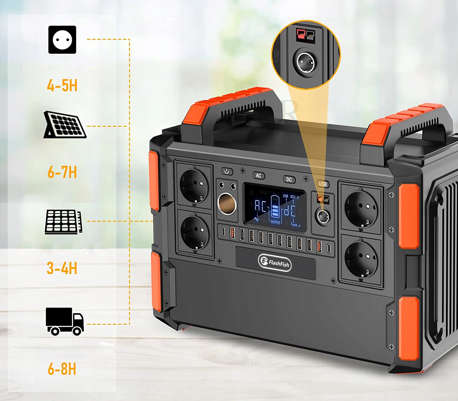 , оснащенные 4 выходами переменного тока чистой синусоидальной волны, 2 выхода DC, 8 выходов USB, 2 USB QC 3.0 выходов, 2 типа C и 1 CAR зарядка, Flashfish F132 могут заряжать до 19 электронных устройств одновременно.