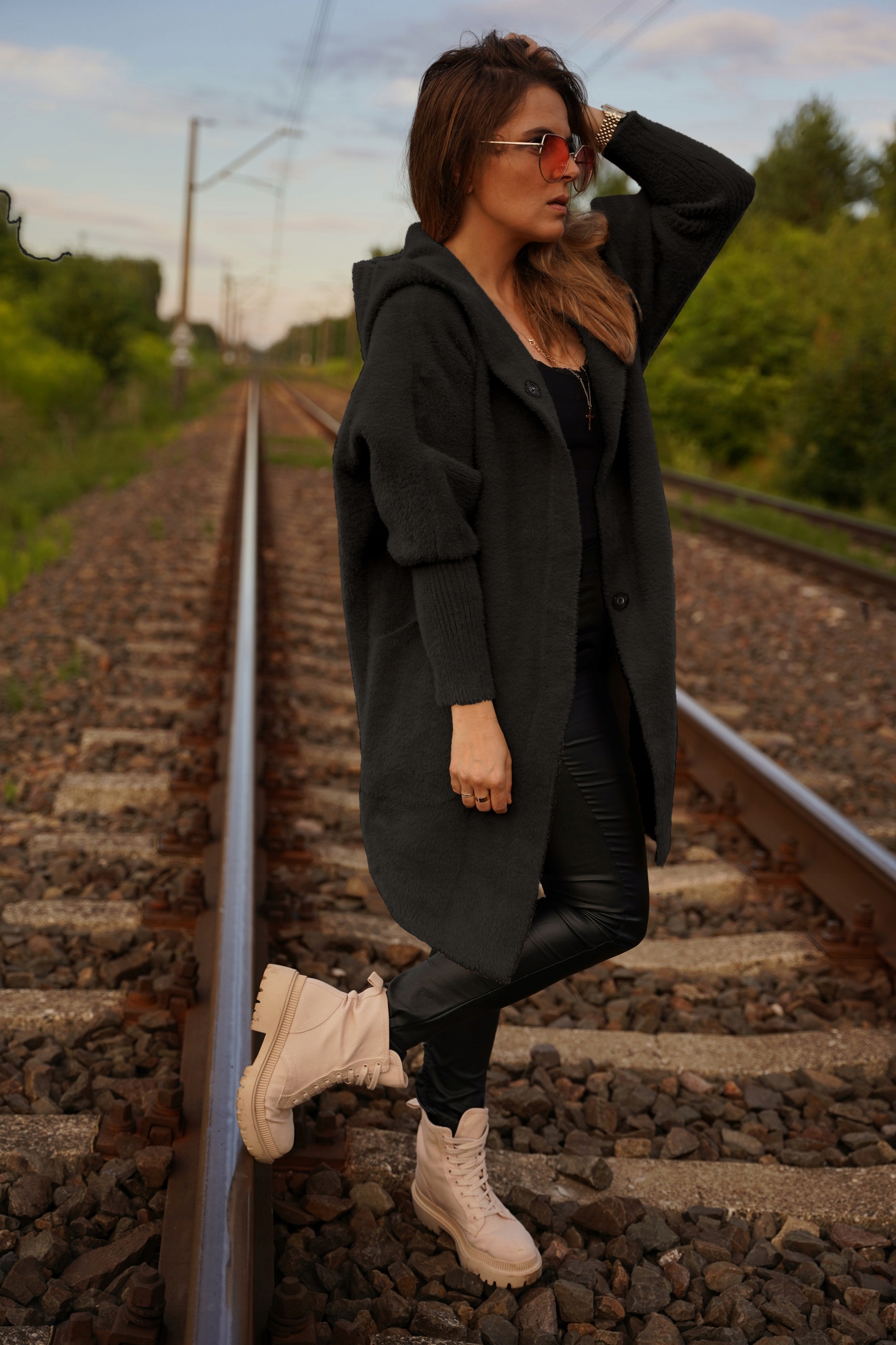 Необычайное ДЛИННОЕ ПАЛЬТО С КАПЮШОНОМ АЛЬПАКА, ЧЕРНОЕ.