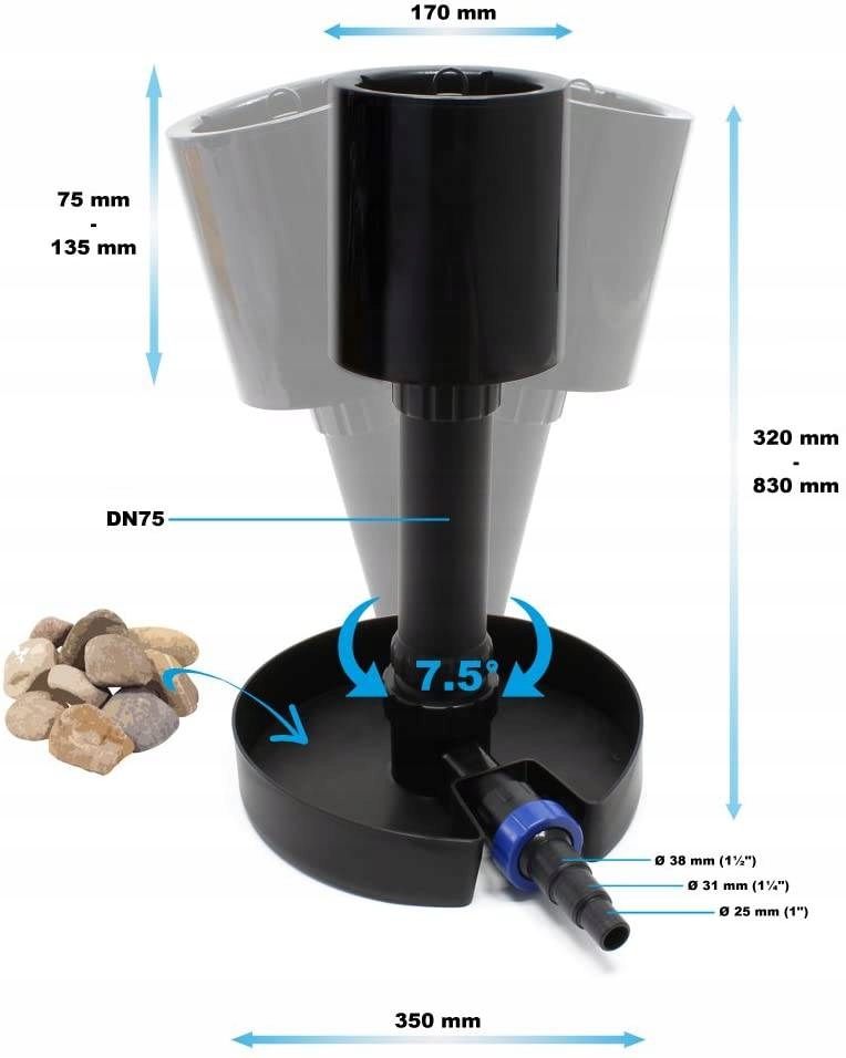 CSP-40 представляет собой стационарный поверхностный фильтр «скиммер», размещаемый на дне резервуара. Он собирает с поверхности воды примеси, такие как листья, трава, пыльца, насекомые, пыль, остатки пищи и другие загрязняющие вещества, прежде чем они упадут на дно. Благодаря этому снижается перегрузка питательными веществами, которые вызывают биологическое равновесие в водоеме, что приводит к цветению водорослей. С помощью насоса (не входит в комплект) всасывается тонкий слой воды, создавая поток в сторону скиммера. Фильтр предназначен для прудов площадью до 40 м². Оптимальный расход – 8000-16000 л/ч. Крупный мусор, такой как листья или трава, следует регулярно удалять, чтобы избежать снижения эффективности работы фильтра. Основание скиммера следует утяжелить камнями на дне пруда. Универсальный шарнир позволяет адаптировать устройство к слегка неровным поверхностям. Еще одним преимуществом этой модели является регулируемая высота фильтрующей корзины и телескопическая труба, благодаря которой фильтр можно адаптировать под разную глубину резервуара.