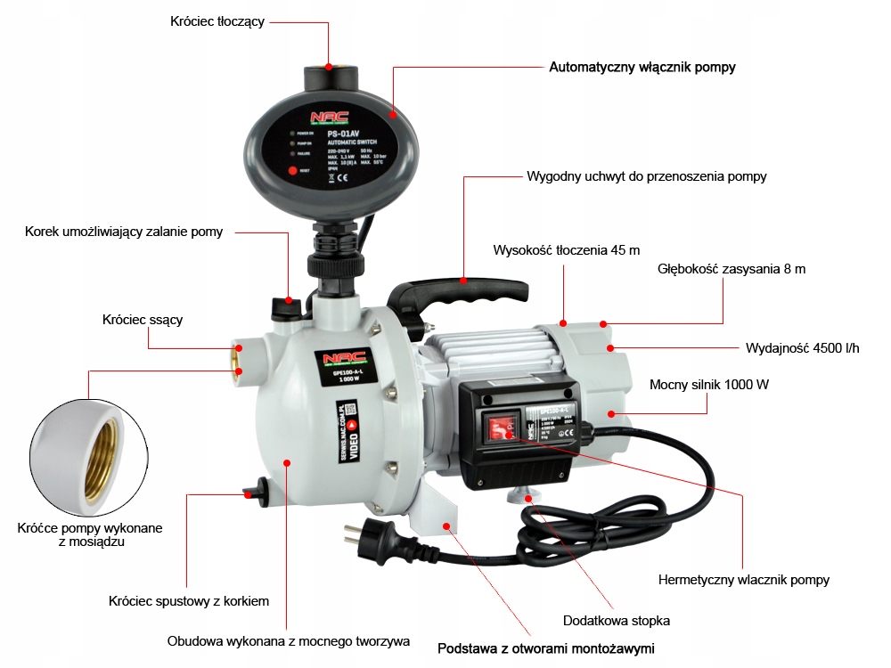 Насос используется в домохозяйстве и в качестве необходимого устройства для заговорщиков. Он имеет очень эффективный двигатель с мощностью 1000 Вт, который позволяет получить емкость 4500 литров/час. и рабочее давление до 2,8 бар. Максимальная высота нажатия составляет 45 метров, а максимальная глубина всасывания составляет 8 метров.