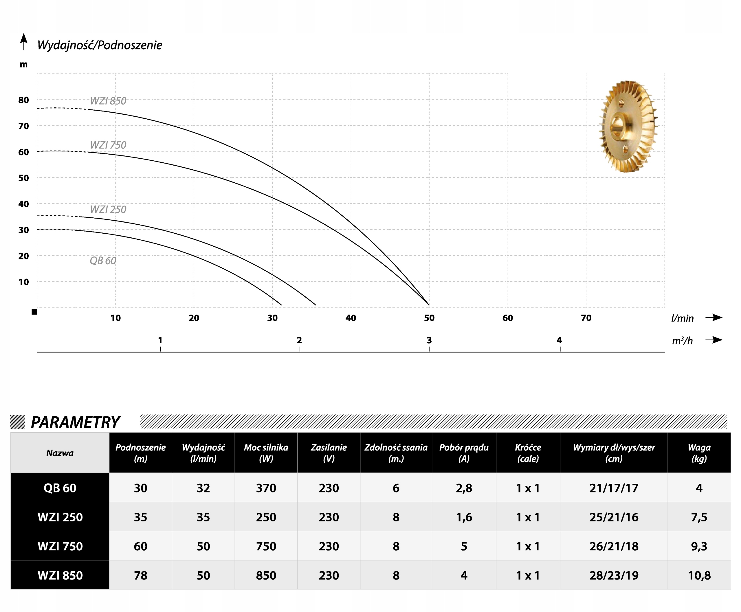 При производстве насоса WZI 250 использовались различные материалы, чтобы сделать устройство максимально функциональным и с меньшей вероятностью выйти из строя. Например, корпус сделан из чугуна. Латунное рабочее колесо. Механический сальник изготовлен из керамики, а вал и ротор – из нержавеющей стали AISI 304.