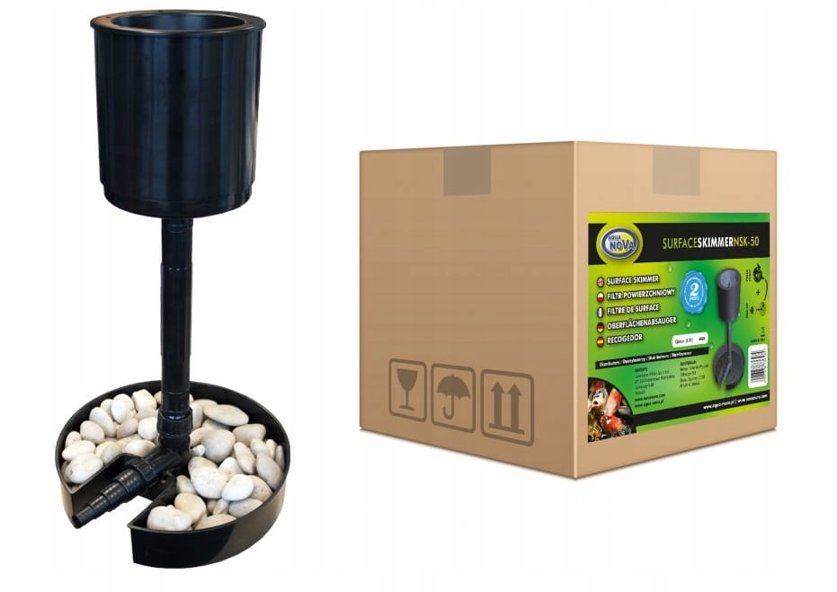 Поверхностный фильтр-скиммер обеспечивает удобную очистку водной поверхности от плавающих примесей, которые создают угрозу биологическому балансу в пруду, что, как следствие, приводит к зарастанию водорослей. Скиммер удаляет: листья, частицы пыли, оседающие на поверхности воды, остатки пищи и другие загрязнения, а также излишки белка (пена – накапливается в результате биологического дисбаланса). Он улучшает прозрачность пруда, поддерживает воду в постоянном движении, а отсасывание нагретой поверхностной воды позволяет поддерживать постоянную температуру в пруду, что снижает рост водорослей. Это увеличивает оксигенацию резервуара и улучшает газообмен.