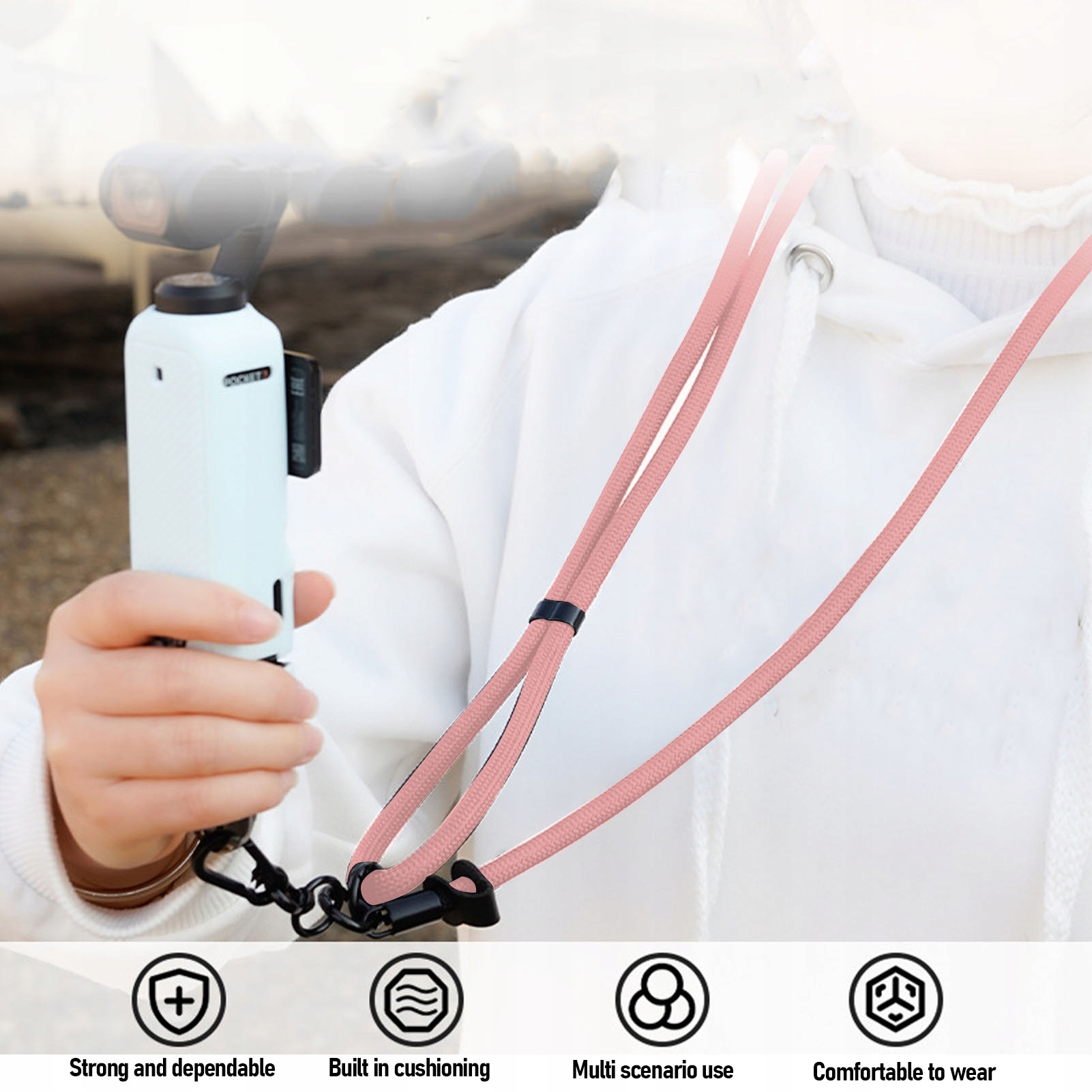 2. Это предотвращает случайные падения: повод эффективно защищает камеру, предотвращая случайное скольжение и обеспечение безопасности устройства во время использования. Он оснащен стручками, которые обеспечивают дополнительную защиту.