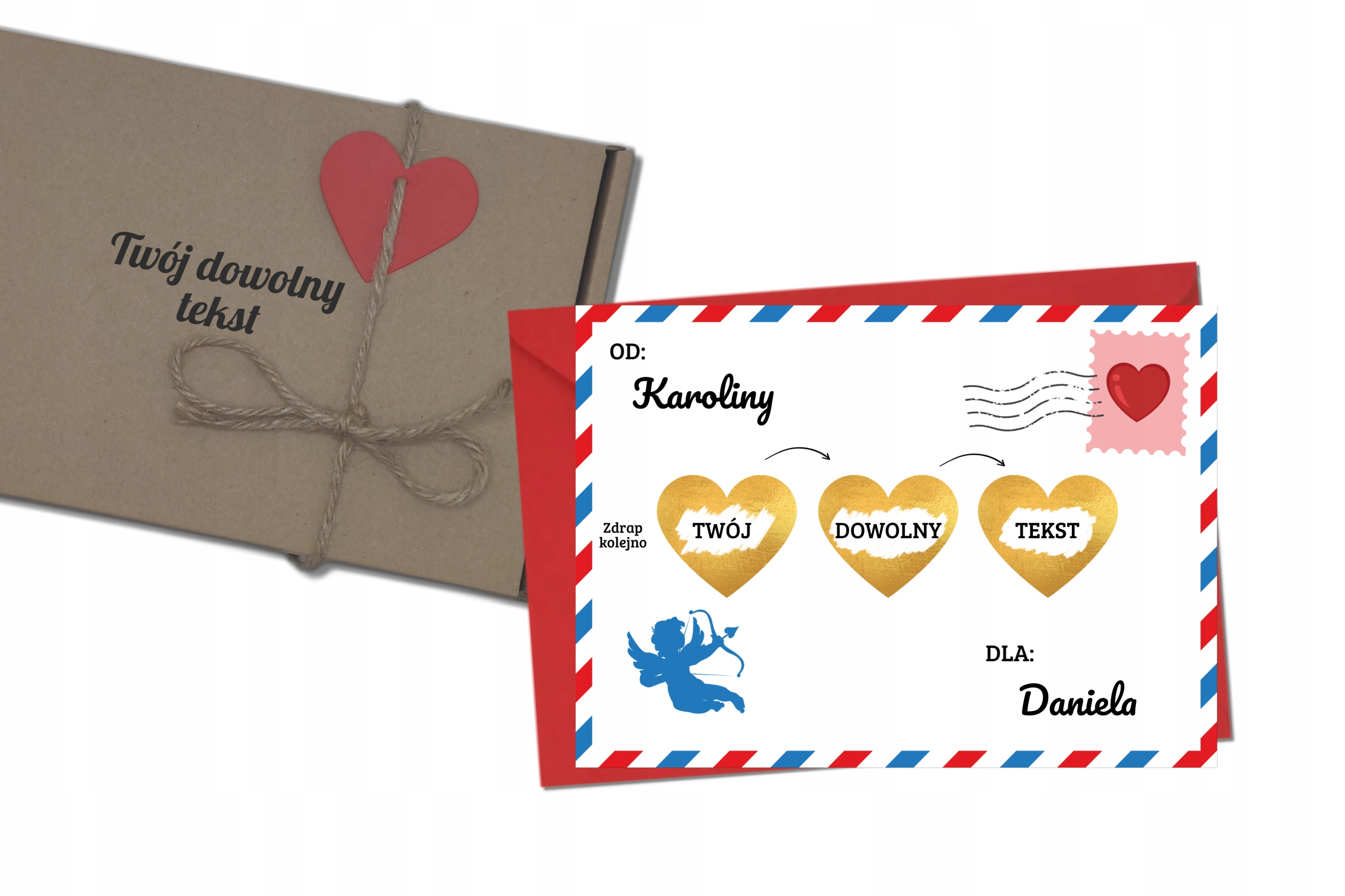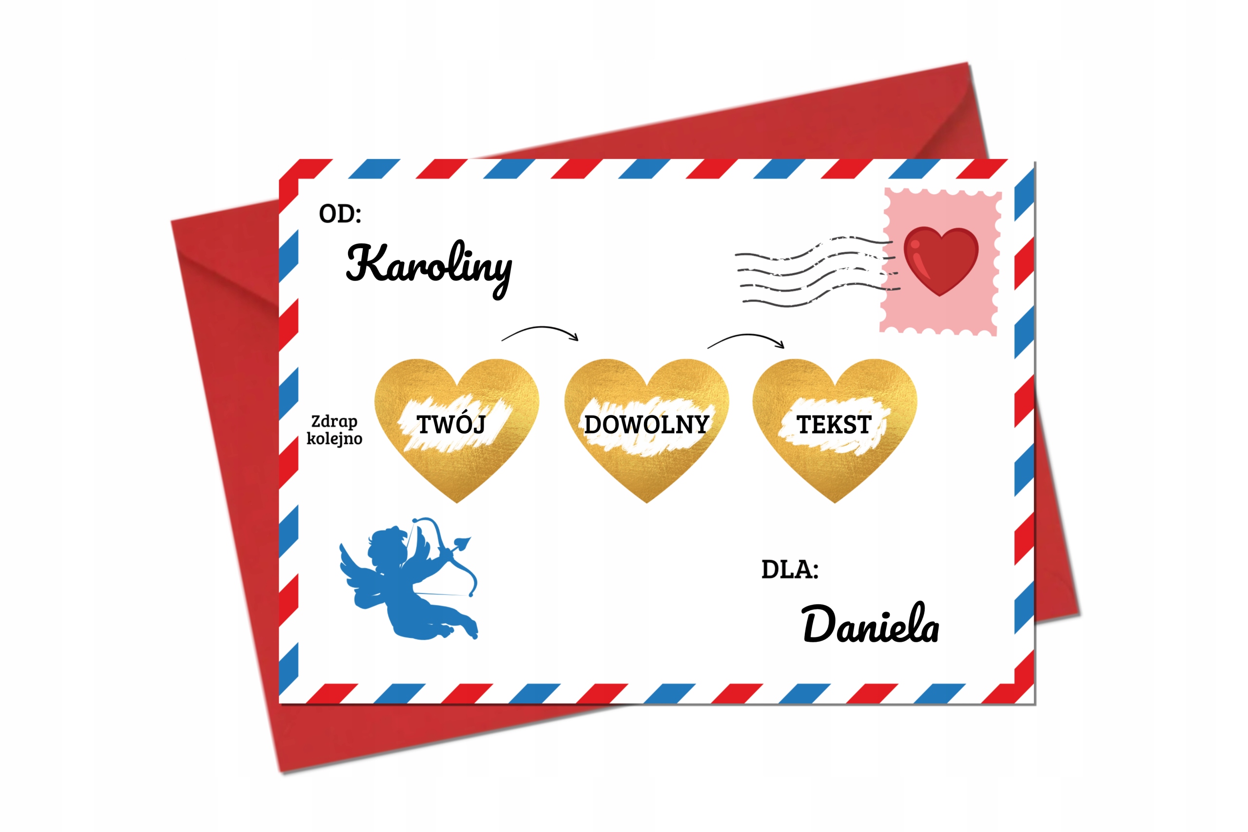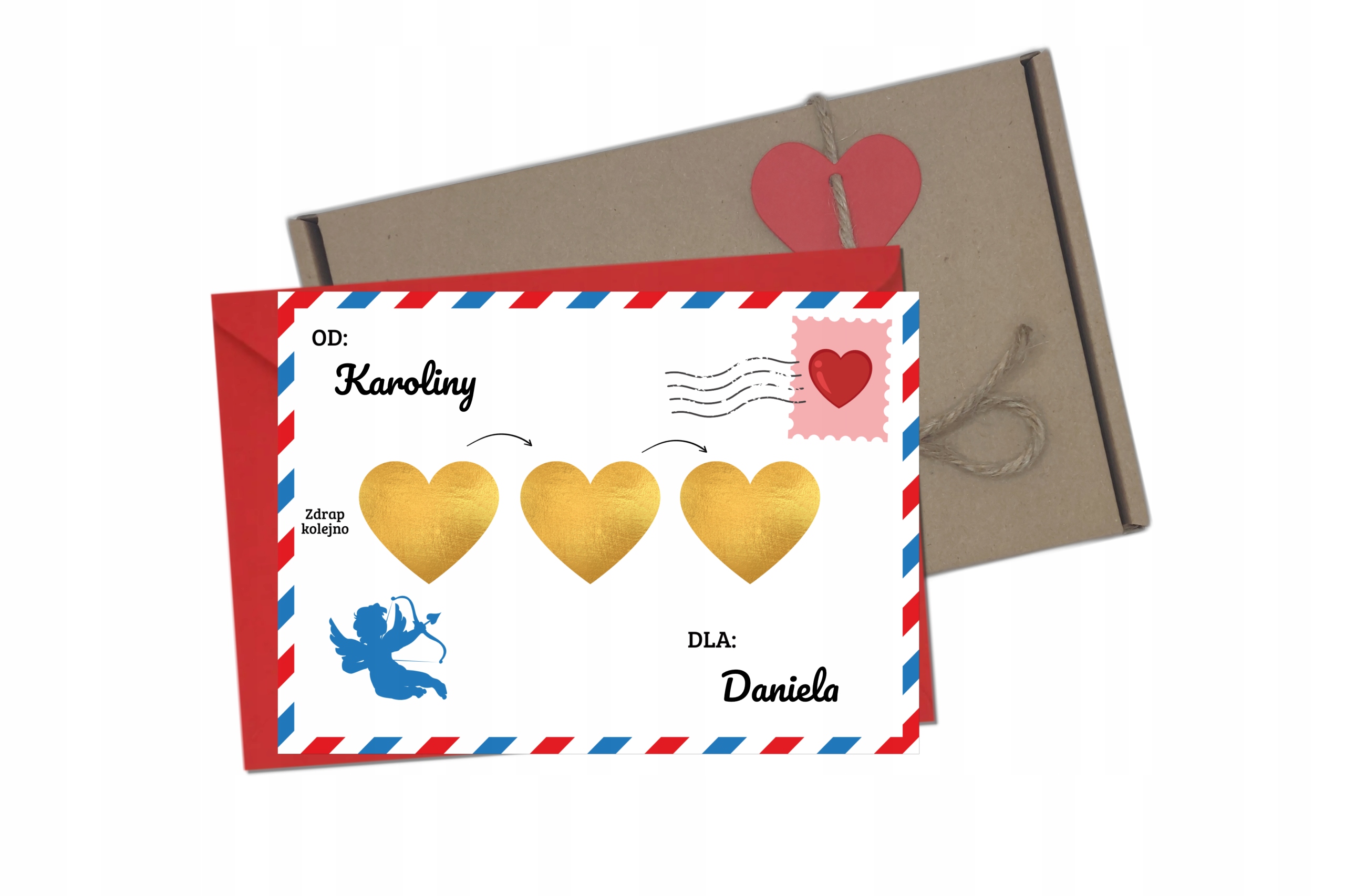 - 3 в форме сердца золотые скретч-карты, под которыми можно разместить любой текст (максимум 4 слова в 1 сердечке)