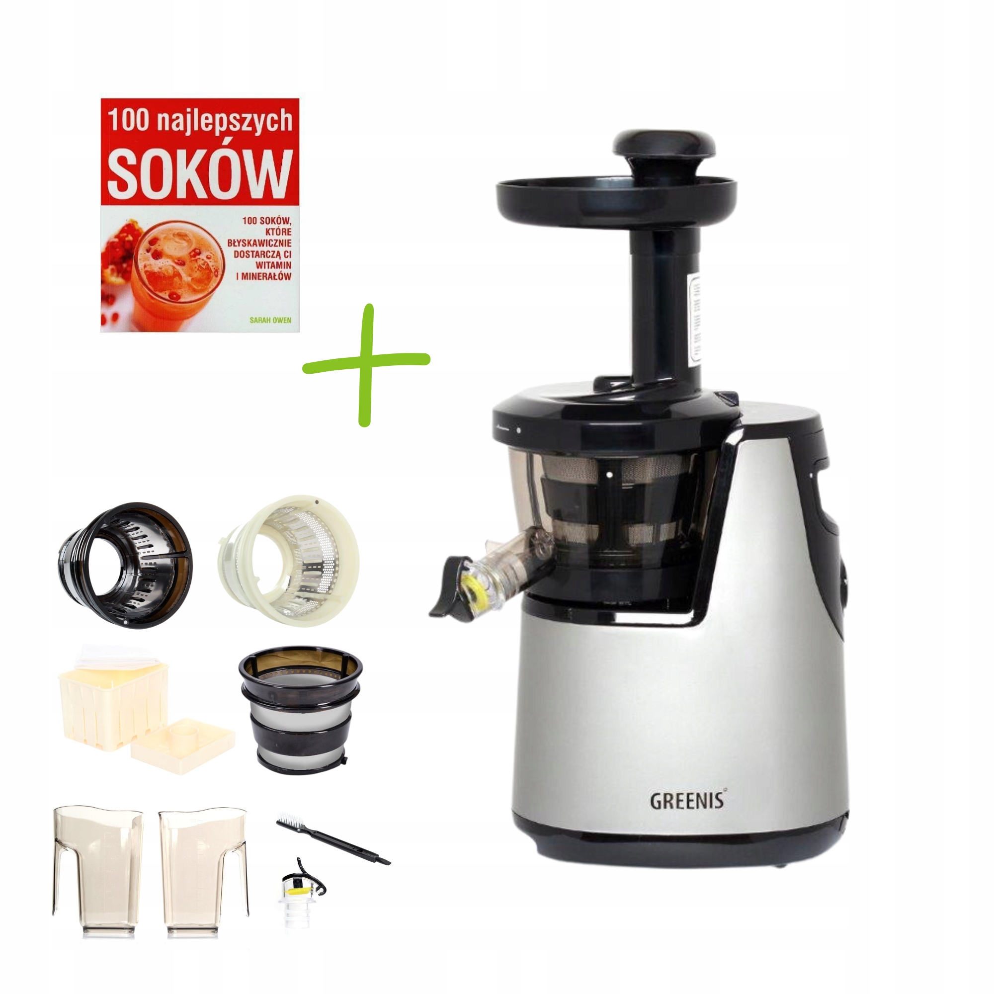 Соковыжималка Greenis F-9010 доступна в девяти цветах: зеленом, коричневом, красном, черном, синем, серебристом, белом и фуксии. Сама модель имеет в комплекте три сита и дополнительную заглушку для выхода сока – так называемую «непроливайка».Два сита изготовлены из ультема – специального материала, который в процессе производства обрабатывается для придания ему необходимой формы. В состав оборудования входит так называемая полное сито, используемое для приготовления муссов и измельчения ингредиентов без отделения сока, сито с мелкими отверстиями (УЛТЕМ) и сито с крупными отверстиями (Полиэтилен). Работу соковыжималки Greenis F-9010 облегчает мощный бесщеточный асинхронный двигатель, работающий со скоростью 65 об/мин.