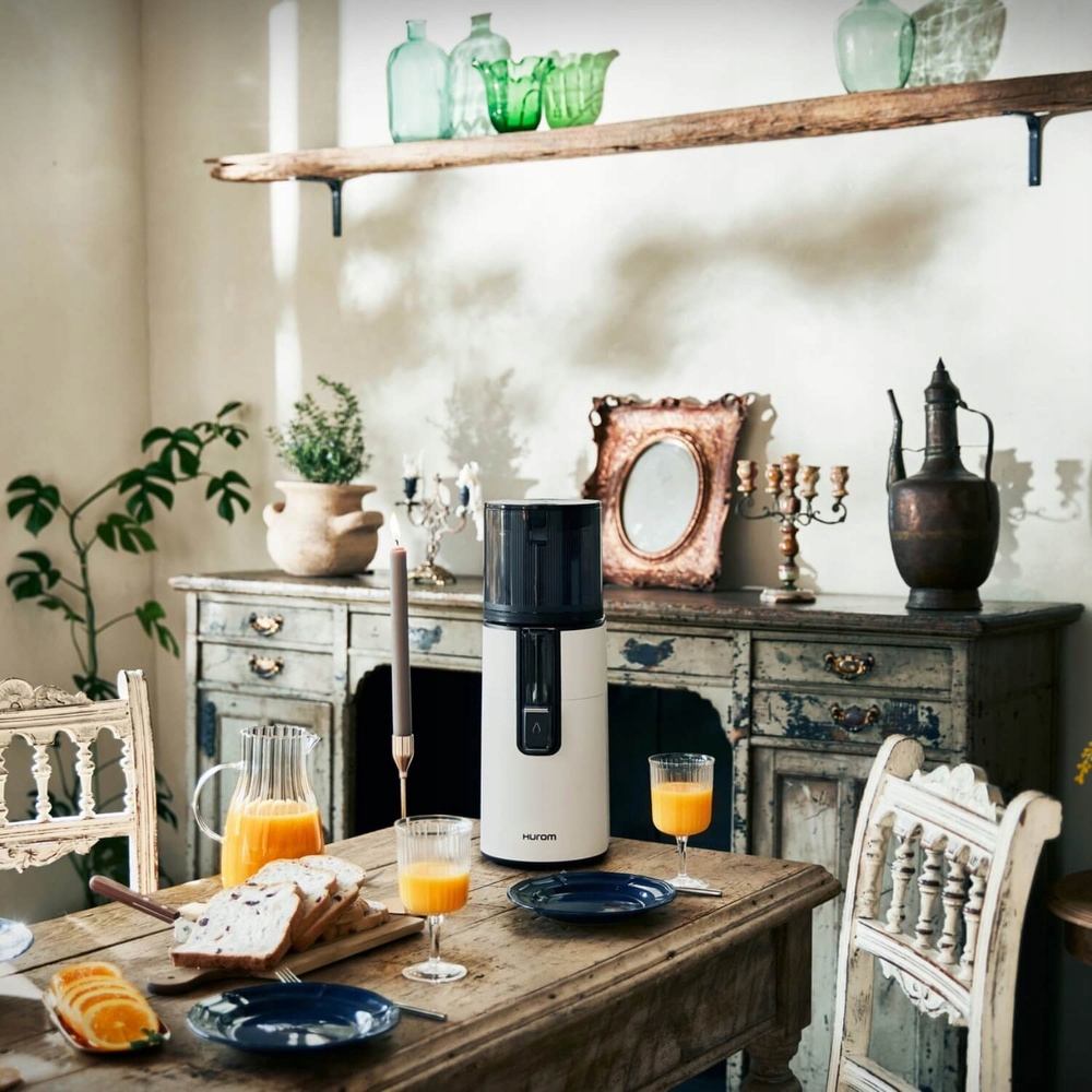 Hurom H400 сочетает в себе минималистский дизайн с компактными размерами и идеально вписывается в вашу кухню. У нас спрятаны сложные механизмы для поддержания стройной формы. Это уникальный продукт для вашего удобства. 🧼