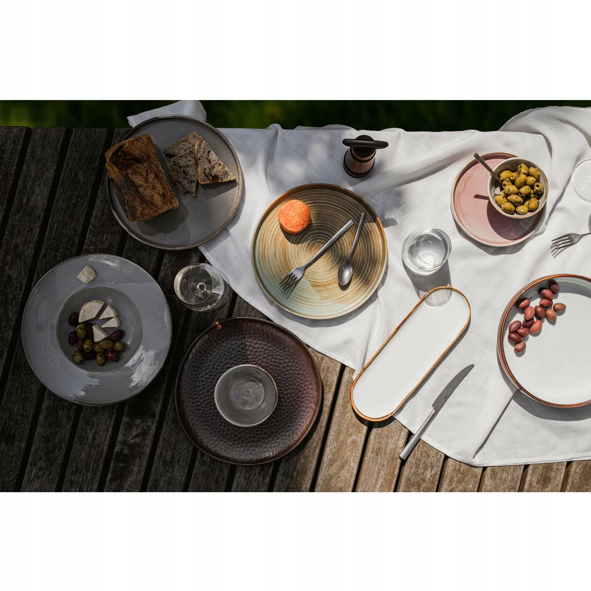 Сочетание двух контрастных цветов и высокого остекления эмали дает восхитительный эффект. Сильная форма посуды и твердость фарфора добавляют эту коллекцию деревенского характера. Дополнительный эффект обесцвечивания и неровного цветового расположения на внешней поверхности сосудов был получен благодаря специальному методу использования реактивной эмали. В результате нерегулярные украшения создаются на поверхности чашек, чаши, тарелок и тарелок. Они выглядят так, как будто они созданы естественным образом. Внешний цвет коричневой-торста мягко проникает внутренней частью блюда и тонко сочетается с оттенком «ледяного» белого. Этот удивительный эффект представляет собой сочетание современности и ссылки на традиционные формы судов. Художественное старение фарфора в настоящее время является очень модной тенденцией в декоре ресторана или столовой.