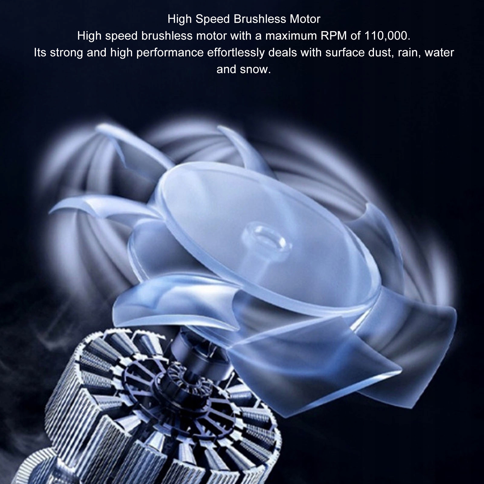 2. Высокоскоростной бесщеточный двигатель: этот пылесос со сжатым воздухом оснащен высокоскоростным бесщеточным двигателем с максимальной скоростью вращения 110 000 об/мин. Его мощность и высокая эффективность легко справляются с поверхностной пылью, дождем, водой и снегом.