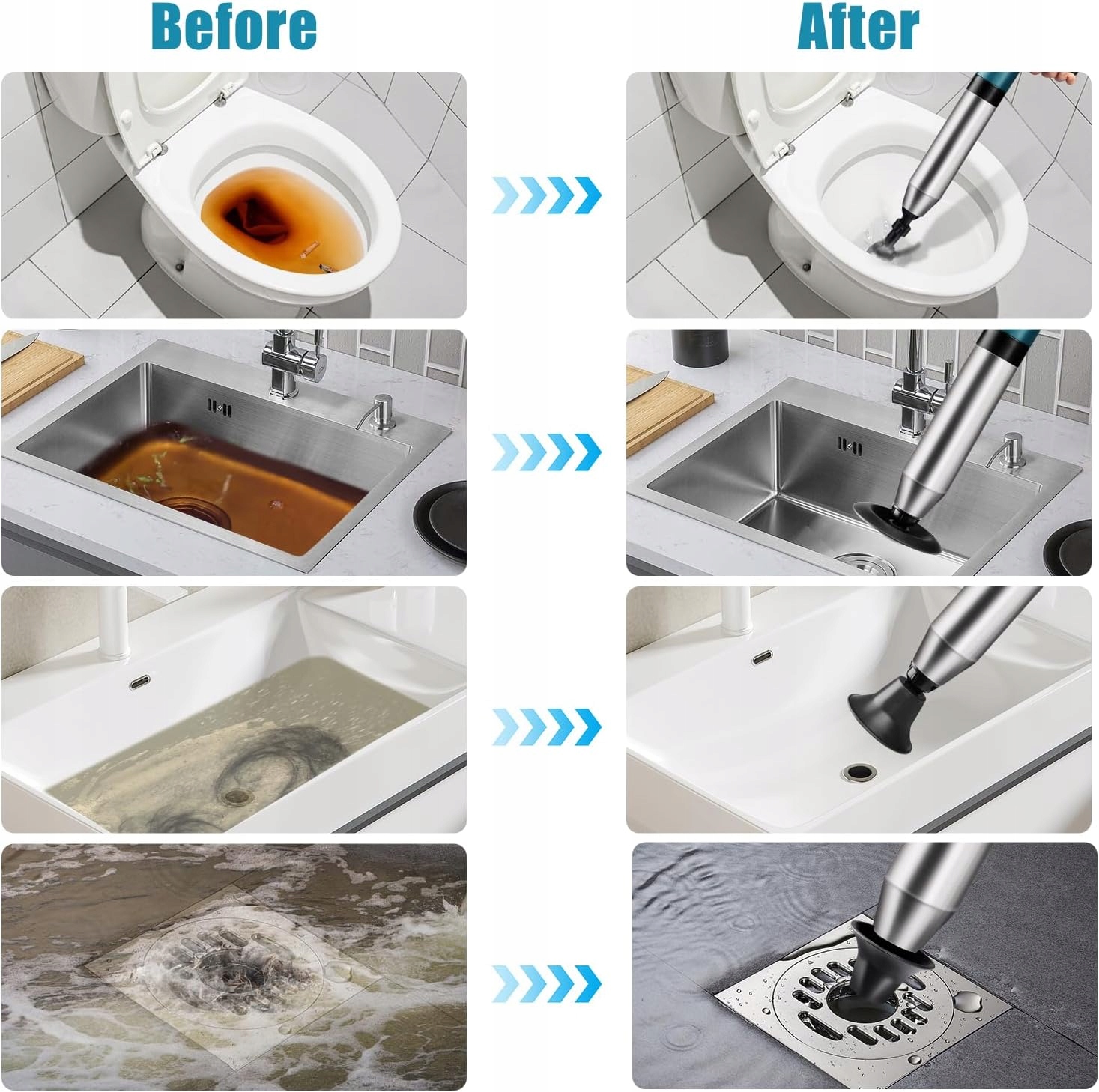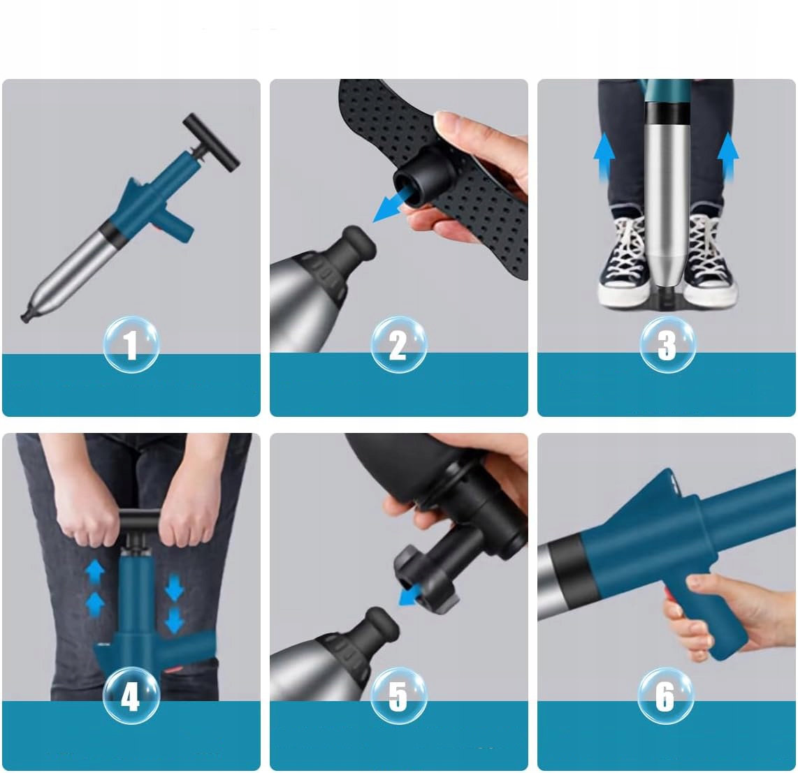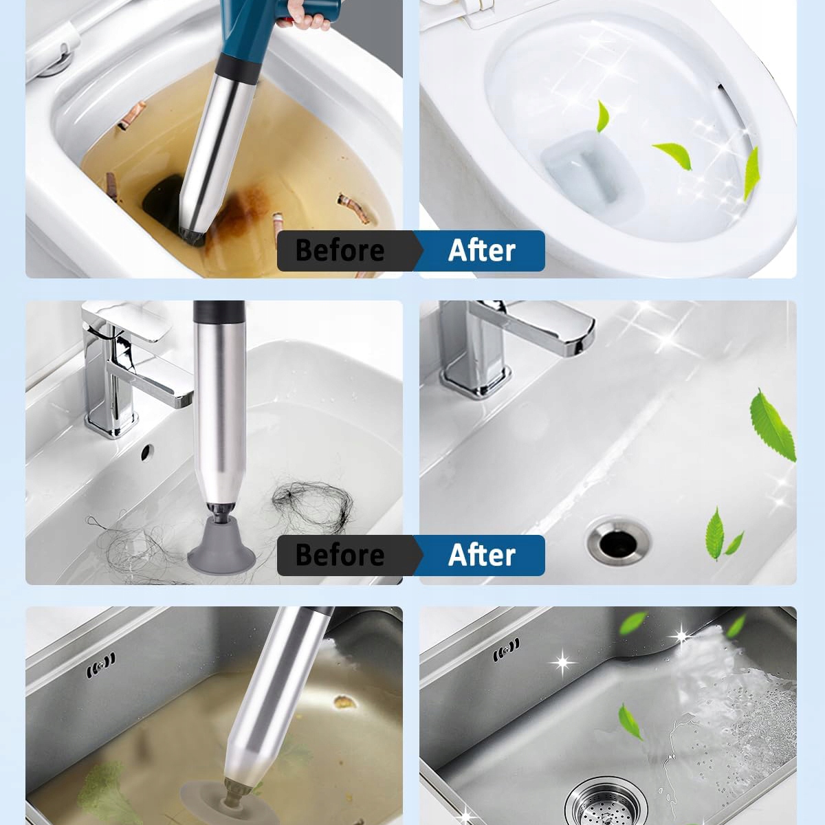 ➡ использует мощность сжатого воздуха высокого давления (до 8 бар) для легкого удаления заторов в трубах за несколько секунд. Обрезанные туалеты, напольные стоки, раковины, трубы и т. Д. требования.