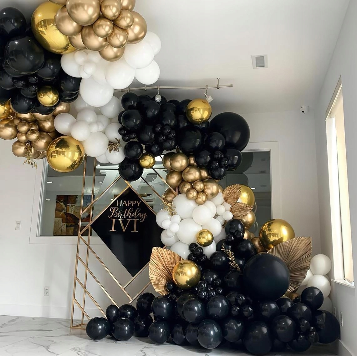 Хромированные воздушные шары прекрасно отражают свет, создавая гламурный эффект. Черно-золотой комплект - это сочетание элегантности, стиля и престижа - идеально подходит для фотосессий, банкетных залов и домашних мероприятий.