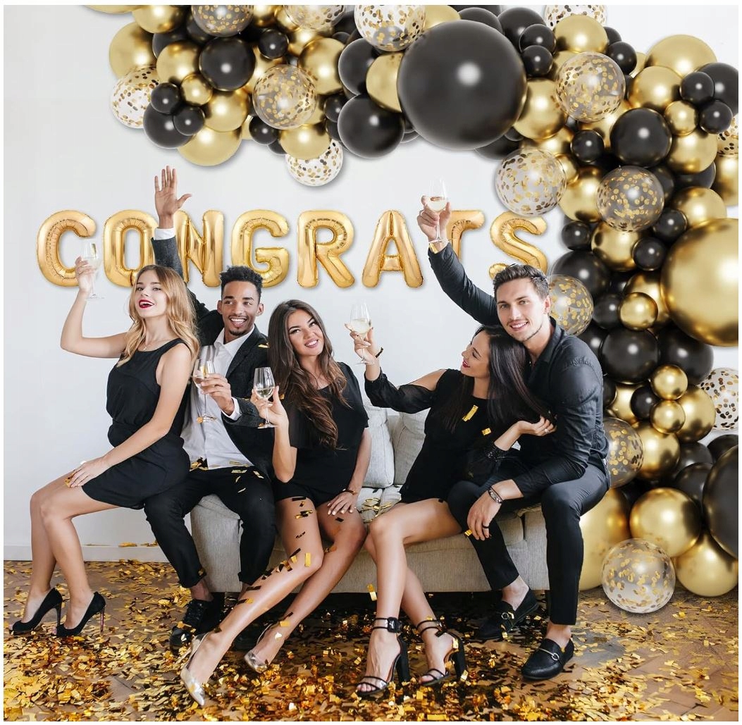✨ Этот разнообразный набор предлагает не только богатство цветов, но и разнообразие размеров, что позволяет создать уникальное и гармоничное украшение. Черно-золотые шары в сочетании с прозрачными шарами-конфетти придают всему произведению элегантный и изысканный характер.