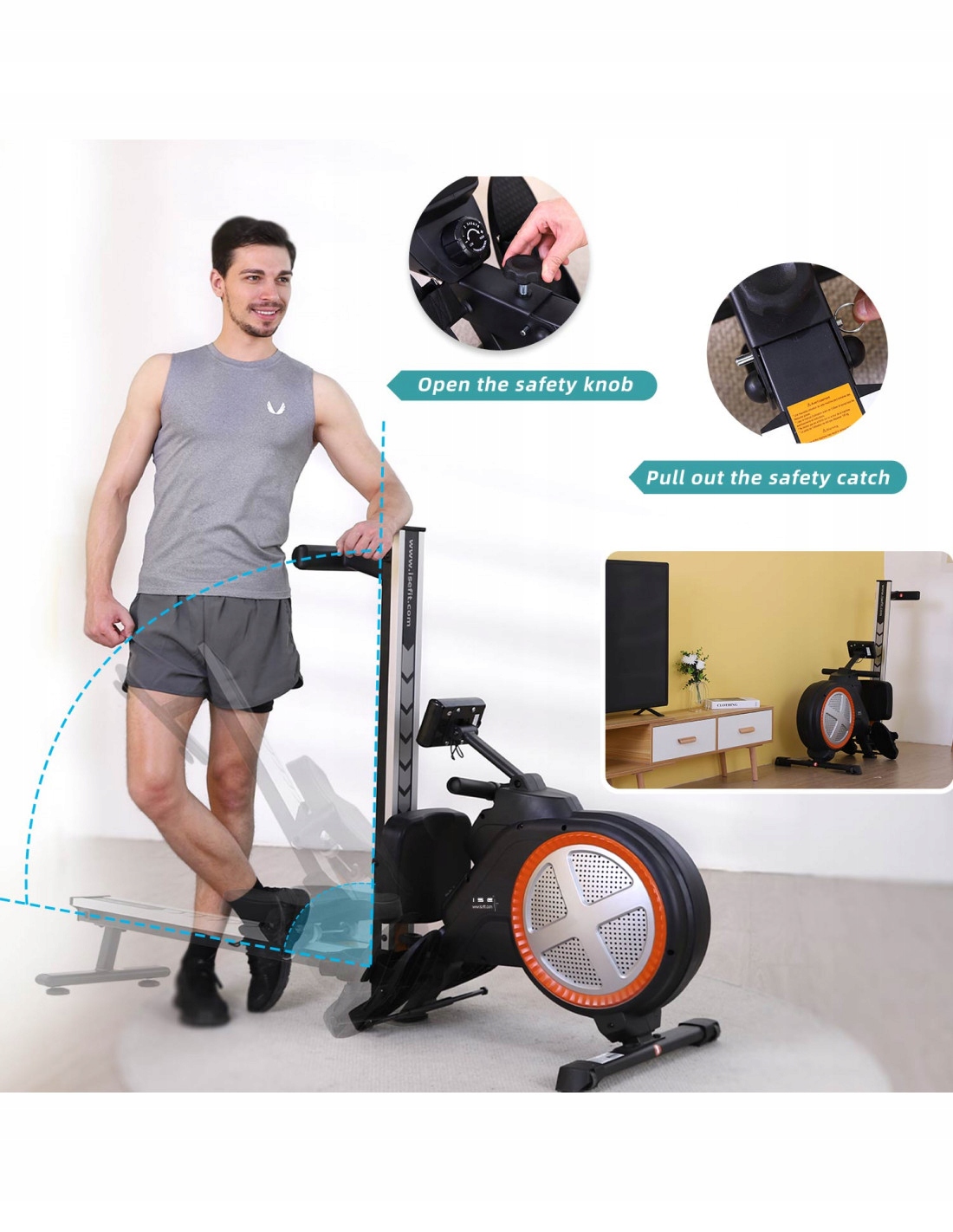 ХРАНЕНИЕ. Гребной тренажер легко складывается на 90 градусов, что экономит до 40% места. Передние транспортировочные колеса позволяют легко перемещать гребца. Идеально подходит для небольших домов и квартир.