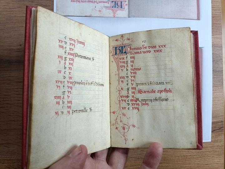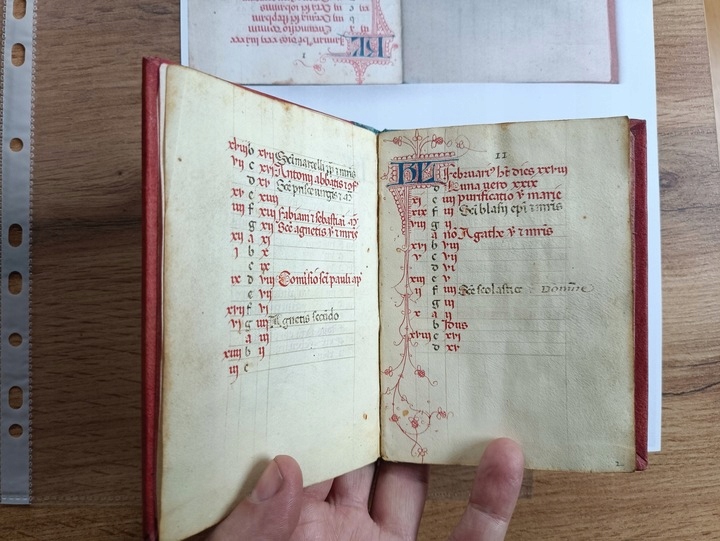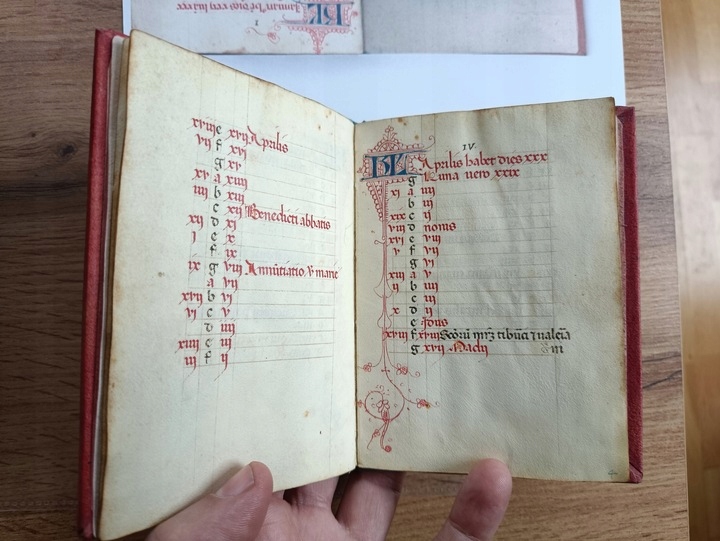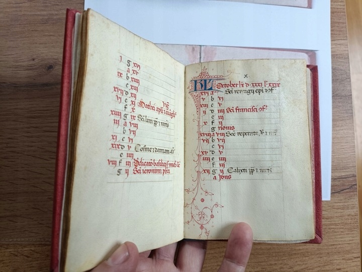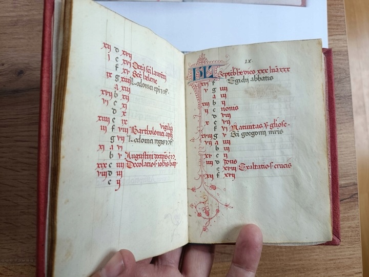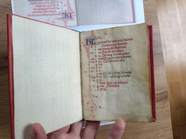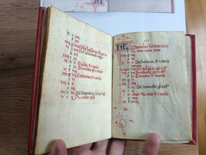 Уникальный, полностью сохранившийся календарь примерно 1450 года. Произведение средневекового скриптория. 12 красиво оформленных карт. Отличное состояние сохранности, учитывая возраст памятника. На последней странице есть более молодая запись (18 век?). Переплет намного моложе - его размеры ок. 13 х 10 см. Цветной пергамент на корешке, форзацы из бумаги ручной работы (еле заметный водяной знак на первой бумажной карточке - дикая свинья - указывает на бумажную фабрику из Свидницы в Силезии). Календарь обычно входил в состав Часов — он начинался в начале рукописной книги, поэтому неудивительно, что позже его переплетали отдельно.