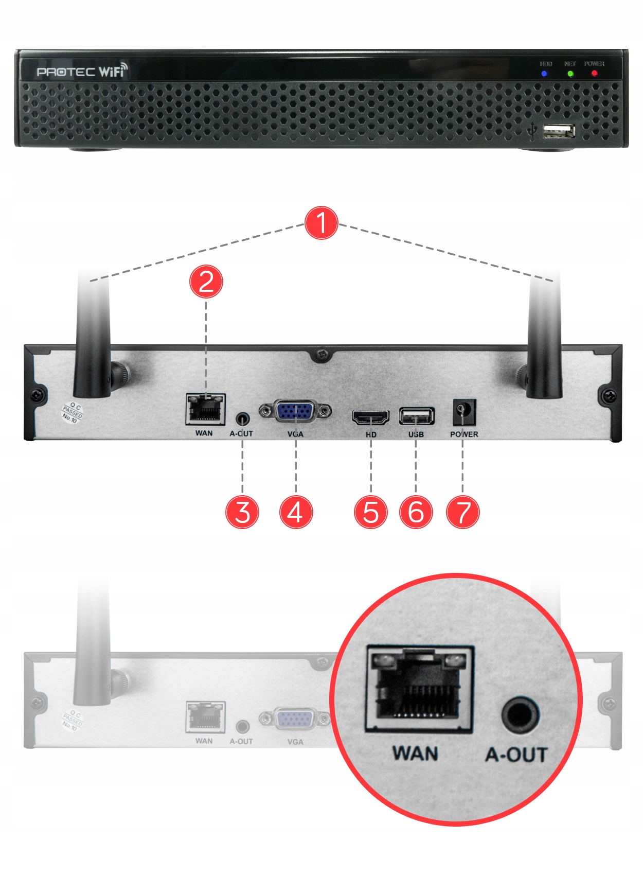 USB-порты позволят позволяет удобно подключить мышь для управления рекордером (USB-мышь в комплекте), а также одновременное подключение переносной памяти для скачивания записей с камер.