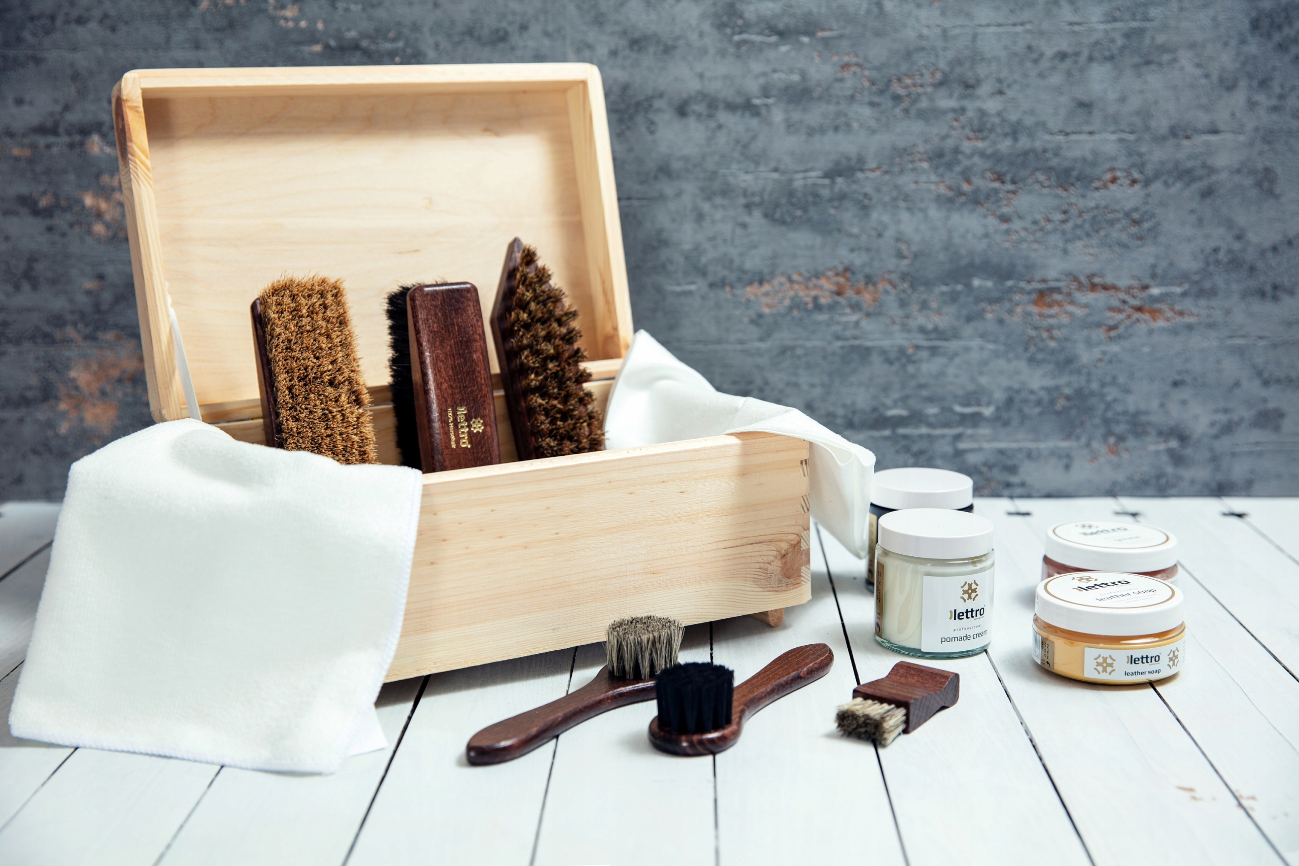 Чистить кожаную обувь легко и доступно с полным набором для чистки обуви Lettro. В коробке Lettro есть все необходимое для поддержания вещей из гладкой кожи в идеальном состоянии. В полный набор для ухода входят шесть деревянных эргономичных щеток для обуви, смазка Lettro, мыло для кожи, два разных крема-помады и две салфетки из микрофибры. Каждый предмет в коробке был тщательно разработан и создан для чистки, кондиционирования, полировки и защиты изделий из гладкой кожи, включая кожаную обувь, обувь, сумки, ремни и мебель.
