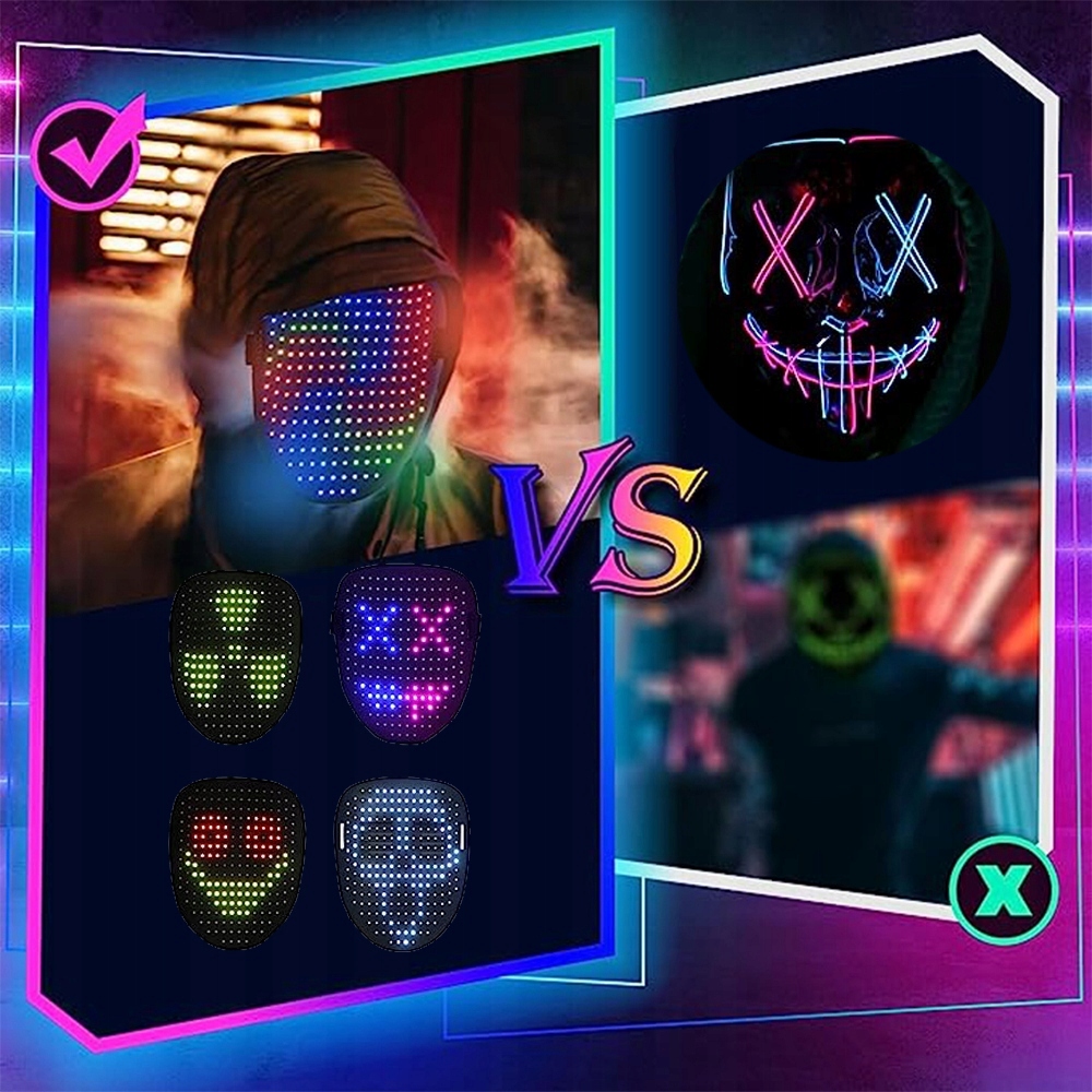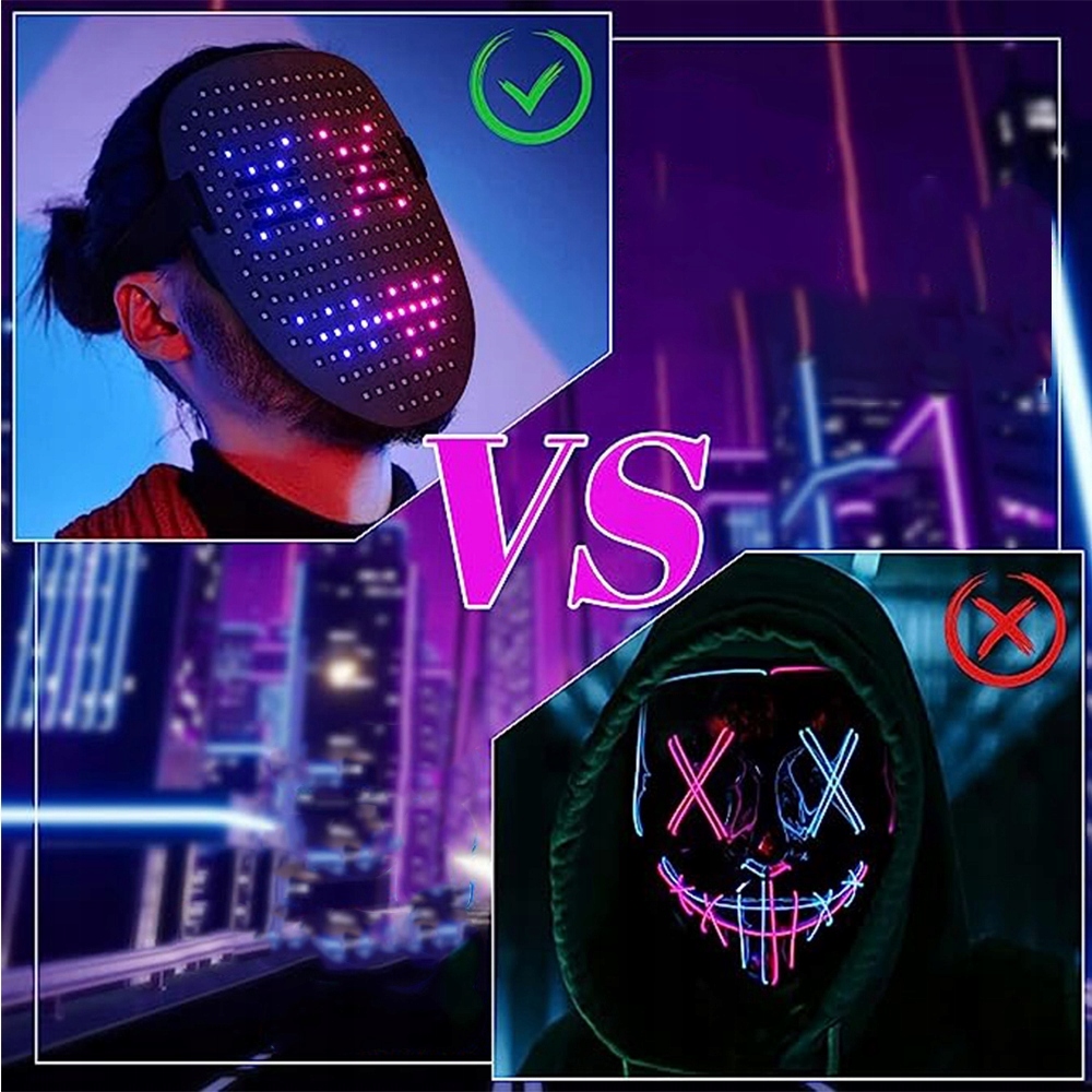 - 🤖Дисплей с 50 узорами.- Светодиодная маска имеет 25 динамических дисплеев. режимов и 25 статических изображений, светодиодную маску можно настроить на один цвет, вспышку, цветовой градиент, плавное и многоцветное, вспышку, цветовой градиент, плавное. Светодиодная маска для лица — это самая удивительная маска для костюмов и одежды для косплея, привлекающая всеобщее внимание.
