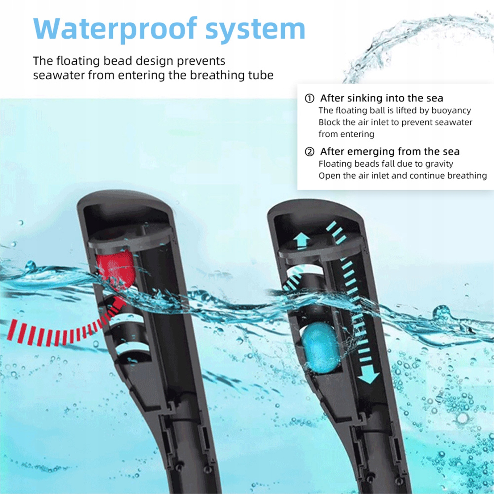 - Двойная дыхательная трубка: снаряжение для подводного плавания оснащено двойной дыхательной трубкой, которая обеспечивает более быструю подачу кислорода и предотвращает накопление углекислого газа.