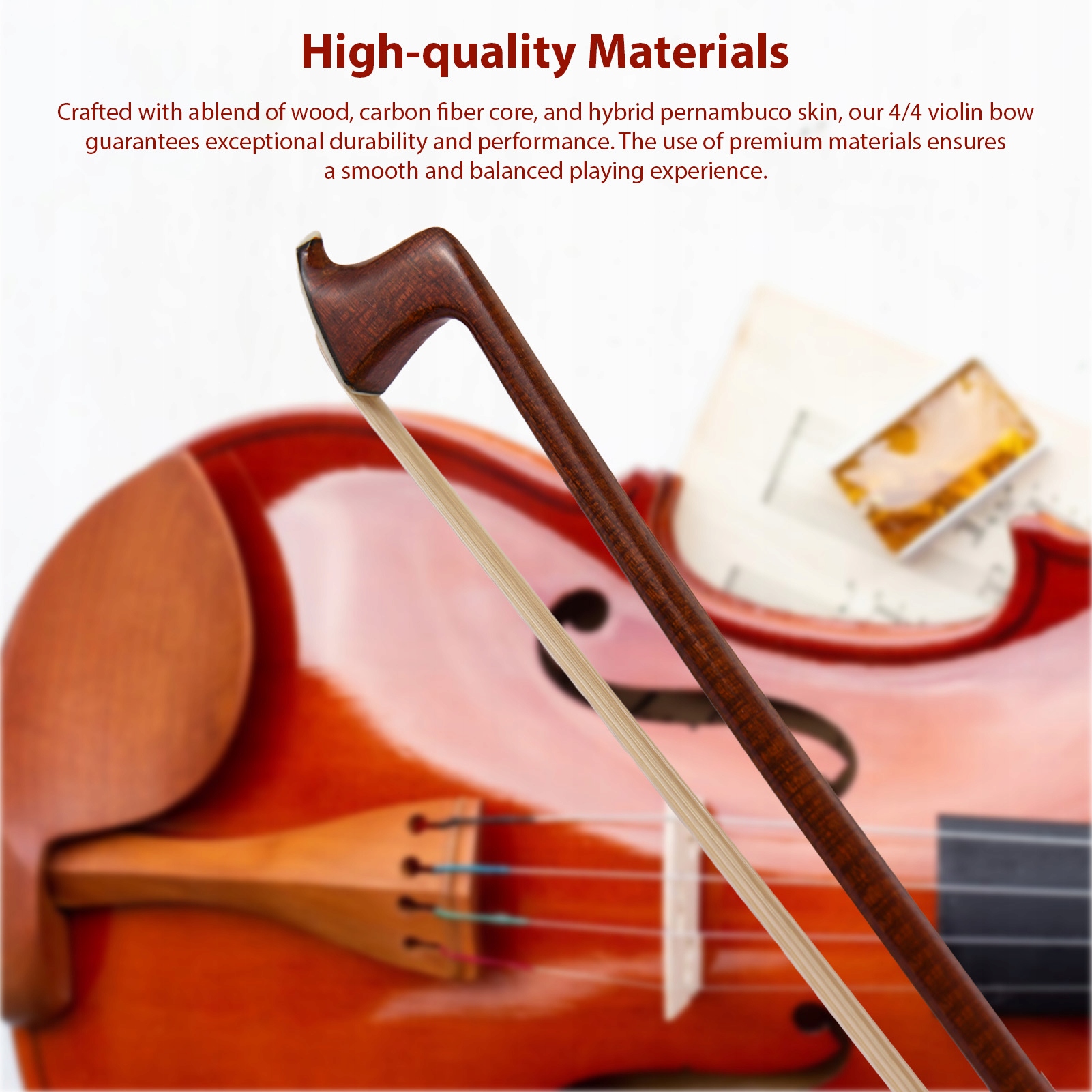 1. 【Высококачественные материалы】: Наш скрипичный смычок 4/4, изготовленный из смеси дерева, сердечника из углеродного волокна и гибридной кожи пернамбуко, гарантирует исключительную долговечность и производительность. Использование материалов высочайшего качества обеспечивает плавный и сбалансированный игровой процесс.