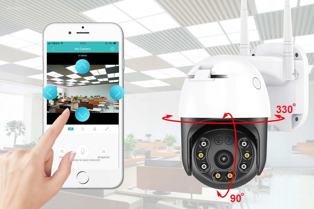 Камеру можно поворачивать на 330° по горизонтали и на 90° по вертикали, что позволяет охватить практически любую территорию.