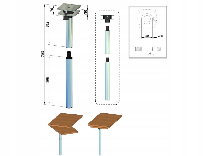 Поворотна ніжка для стільниці караван від 31,2 до 70 см