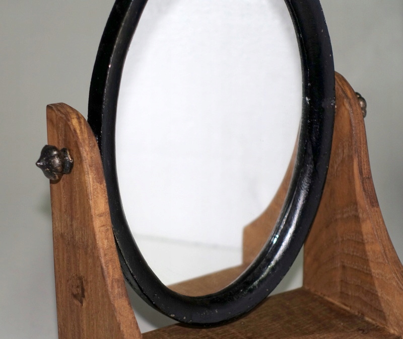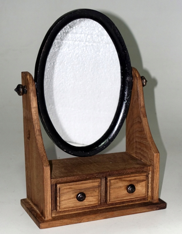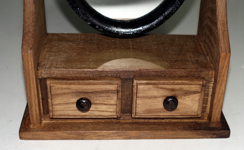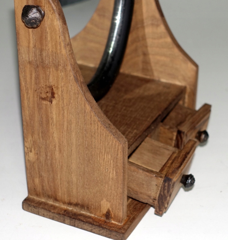 Чугунное, качающееся зеркало на деревянной основе, оснащенное двумя выдвижными ящиками.