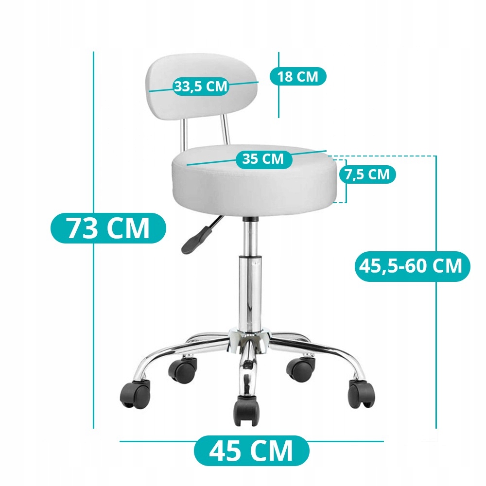 Сиденье косметического кресла имеет диаметр 35 см и толщину 7,5 см, что обеспечивает удобство даже более длительного использования. Задняя часть шириной 33,5 см и высотой 18 см обеспечивает оптимальную поддержку, уменьшая боли в спине. Регулируемая высота сиденья (45,5-60 см) позволяет адаптироваться к индивидуальным потребностям. p>