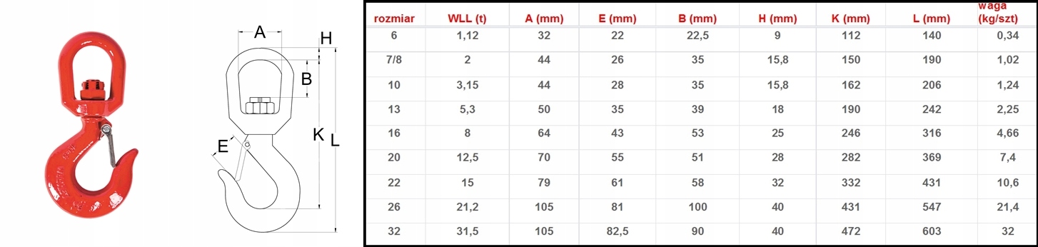 Маркировка: код производителя / Макс. прочность: WLL … T / CE / размер крючка