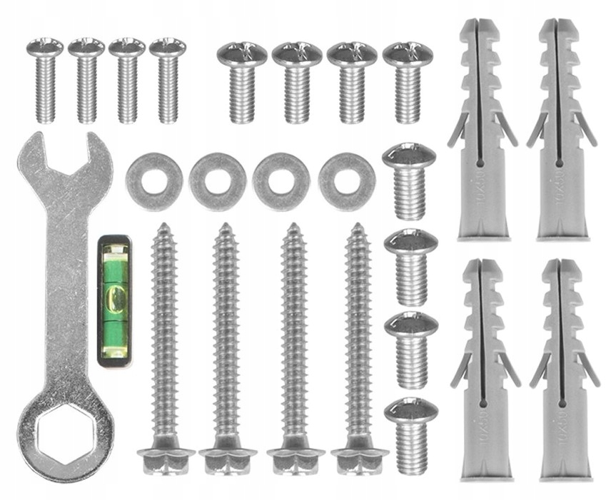 - В комплекте: универсальный набор крепежных винтов для телевизора, а также набор винтов и дюбелей, уровень