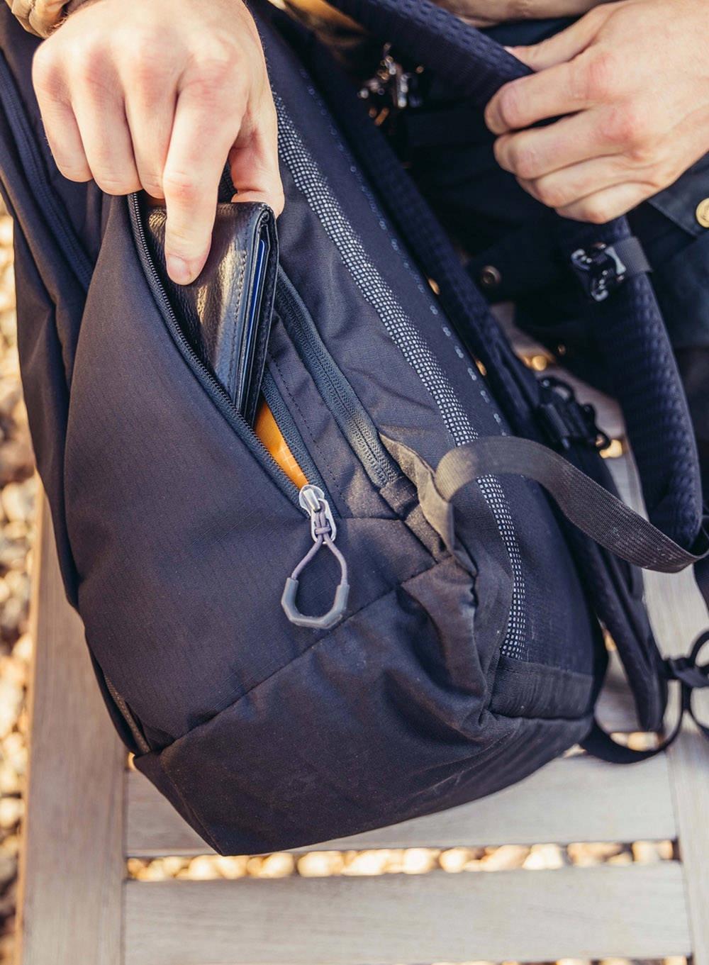 - Все ткани изготовлены из переработанных материалов, что обеспечивает сокращение выбросов углекислого газа на 57 % по сравнению с обычным нейлоновым рюкзаком.