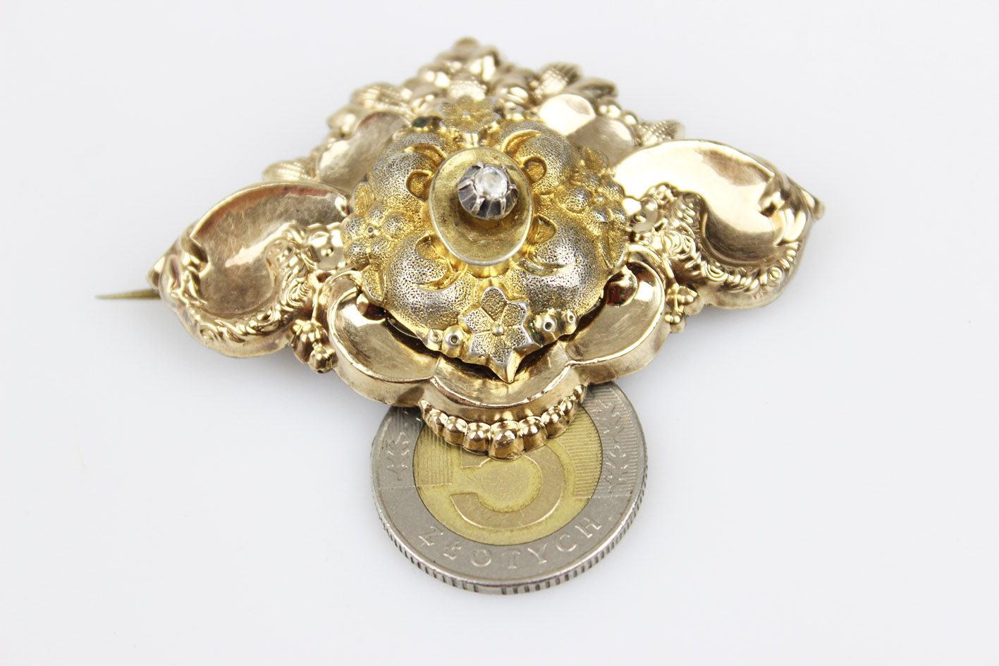 девятнадцатый бродюшн в форме алмаза. Радуемый aival, богато украшенный централизованно встроенным элементом с огражденным стеклом, имитирующим алмаз. Продукт изготовлен в золотом серебра. Брошь находится в очень хорошем состоянии поведения с деликатными ссадинами. Размеры: