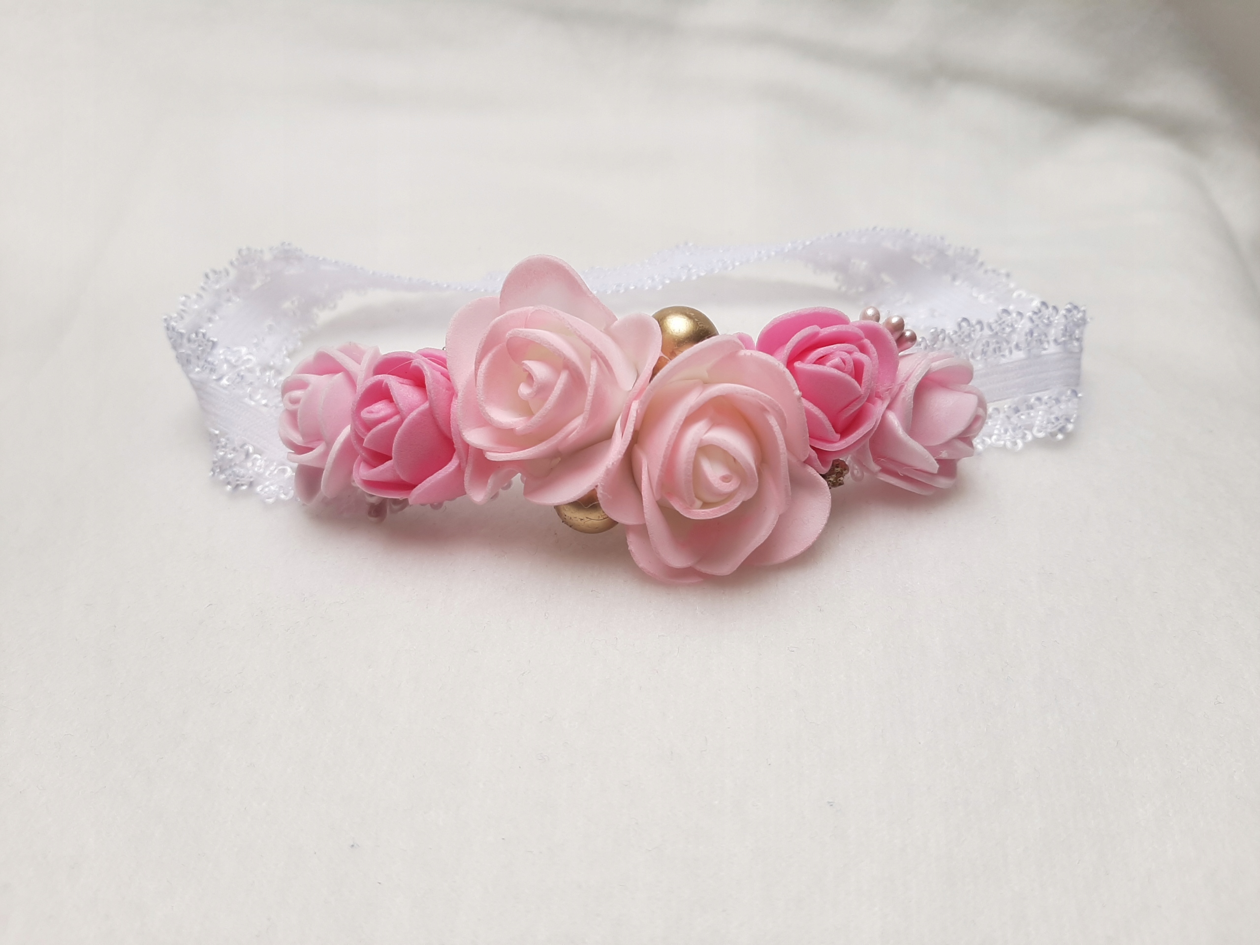 Повязка размещается на резинке шириной около 2 см. Кружево очень нежное, гибкое и выглядит элегантно. Цветочная композиция размером примерно 11см х 4 см состоит из цветов размером 3 см и 2 см.