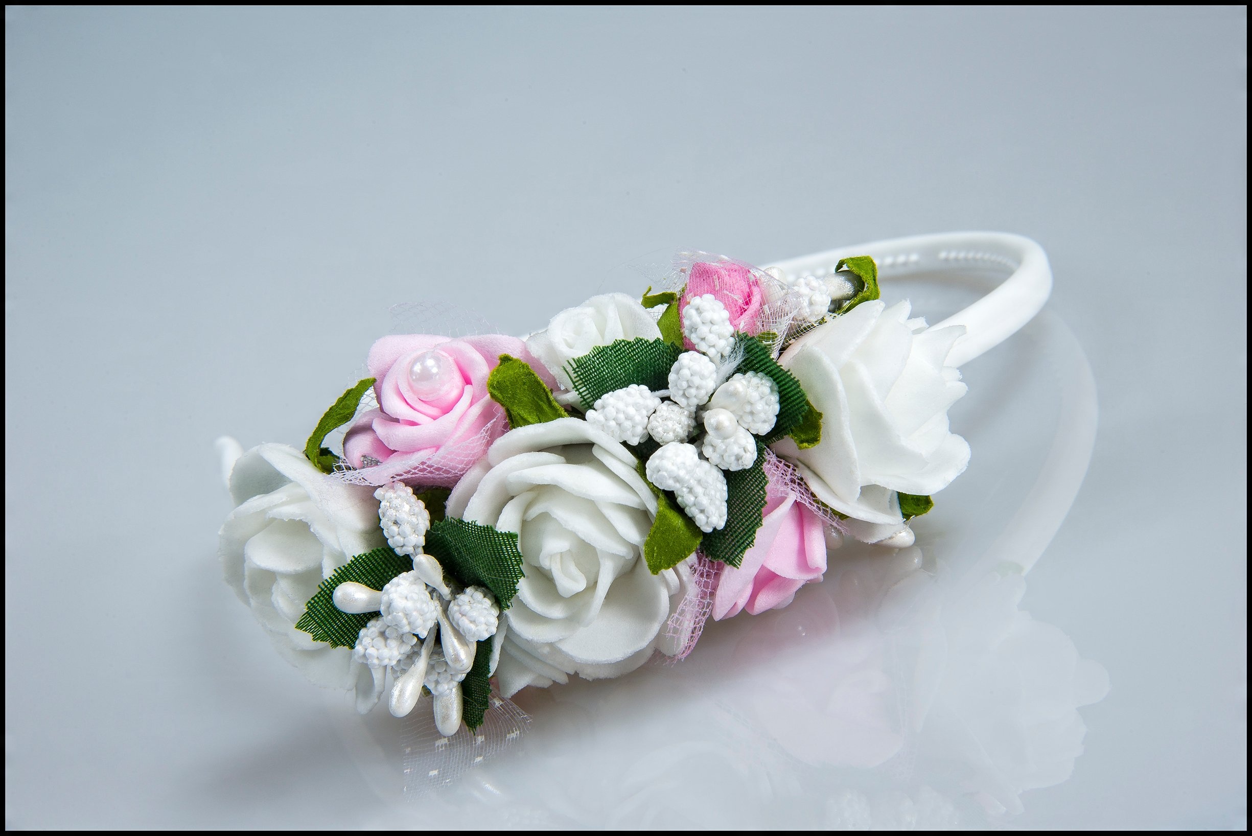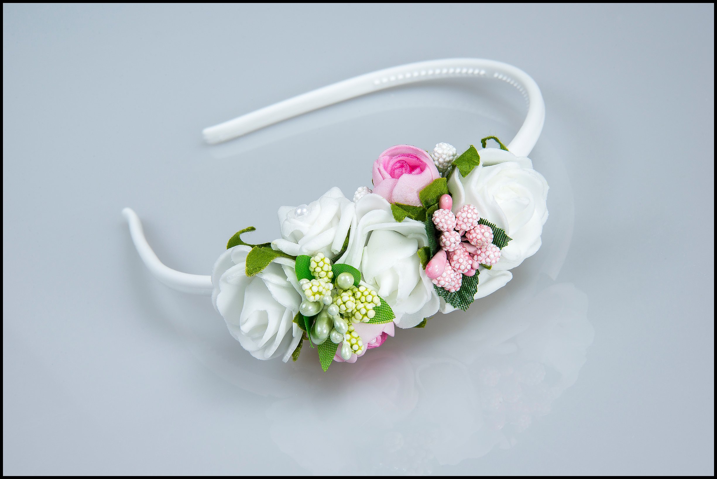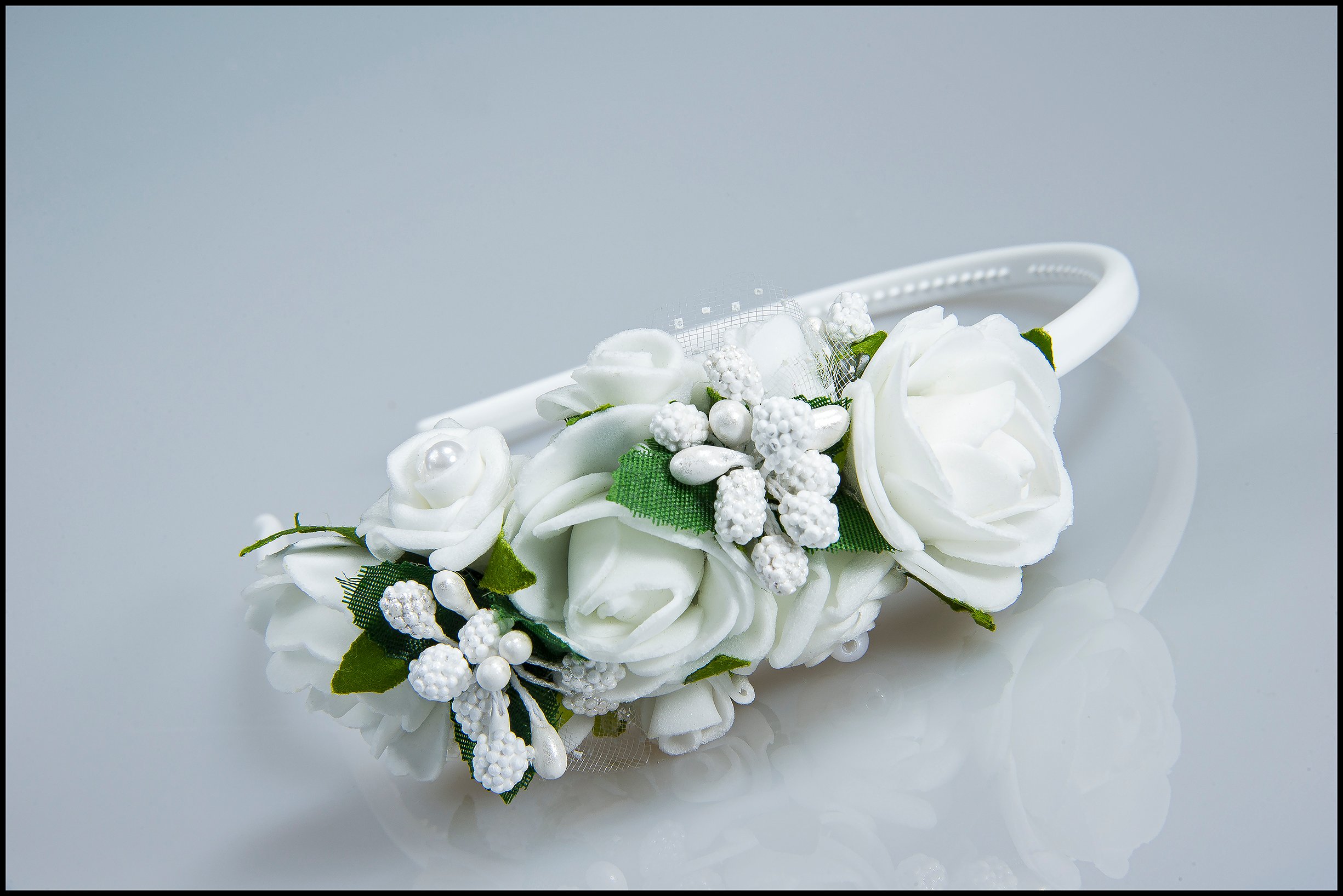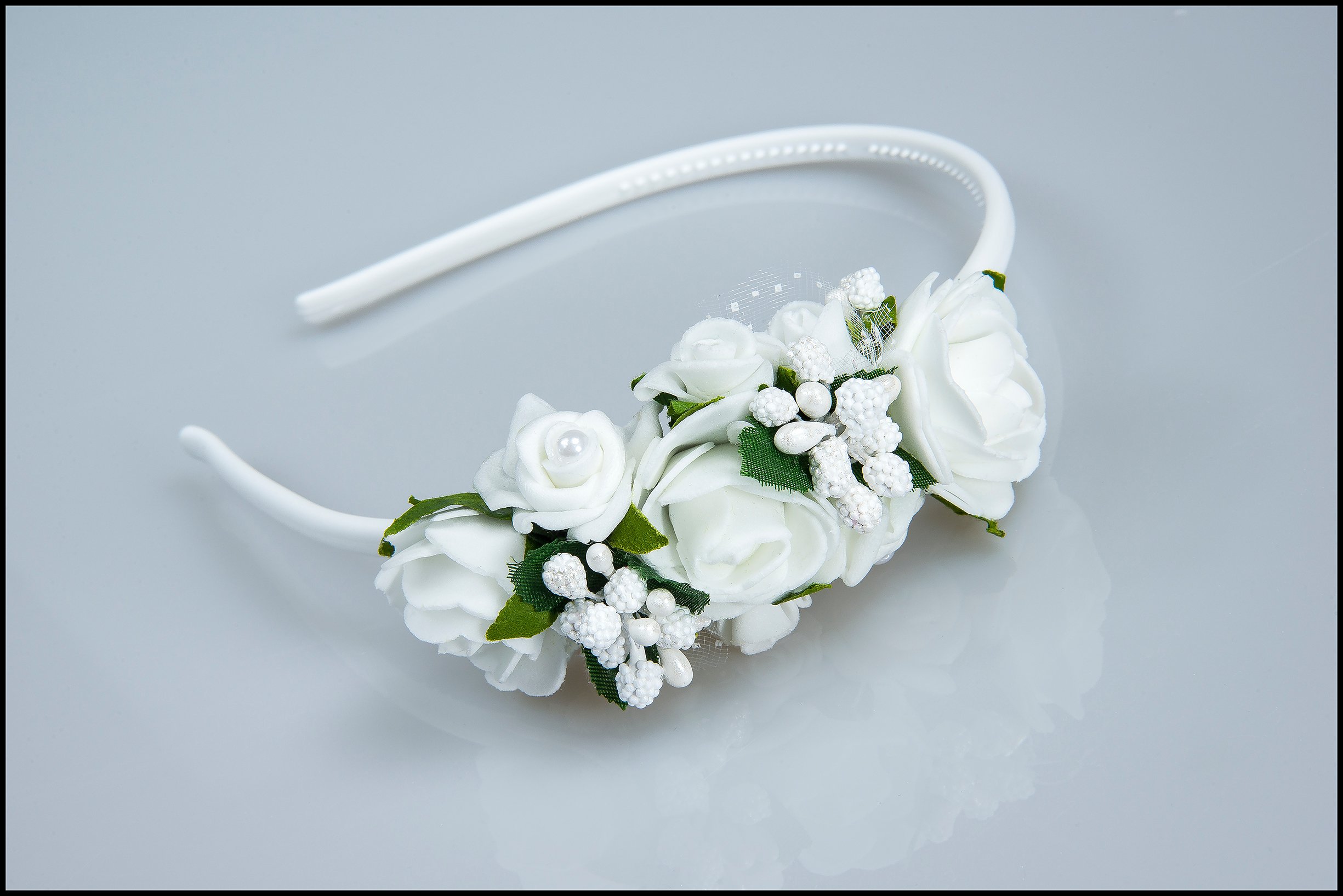 Впечатляющий ободок для причастия из высококачественных роз из пенопласта. Розы из пенопласта выглядят очень естественно, а жемчуг придает украшению элегантности. Идеально подходит для Белой недели или костюма-венка.