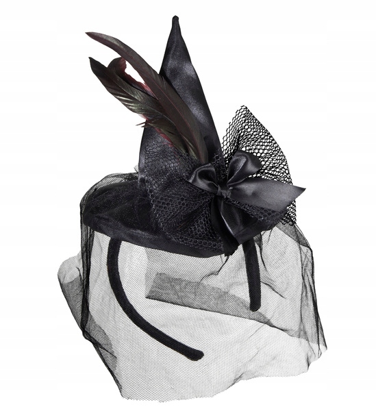 прикреплен к шляпе, прикрепленной к луку с пером и вуалью. Легкая, гибкая полоса не сжимает голову. Обрезается велюровым материалом.