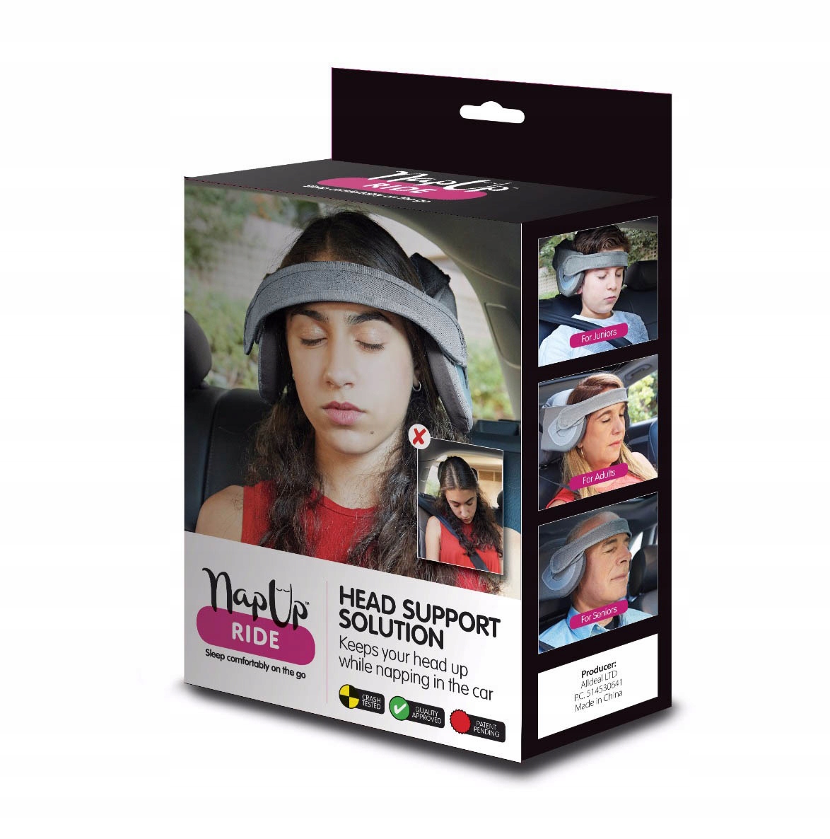 NapUp Ride состоит из двух частей: мягкого, гибкого подголовника, закрывающего встроенный подголовник. в машине и ремень на лоб, который соединяется с подголовником с помощью качественной липучки. Когда ремень не используется, налобный ремень находится в верхнем положении и не ощущается. Когда пассажир чувствует сонливость, он или она может легко опустить этот ремень и насладиться хорошим ночным сном.