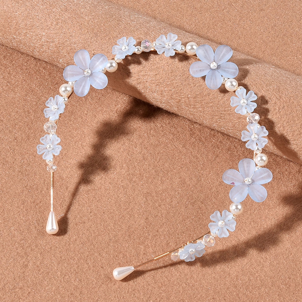 Пов'язка на голову з бісерною гірляндою з декором із синьою квіткою. Волосся